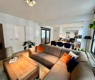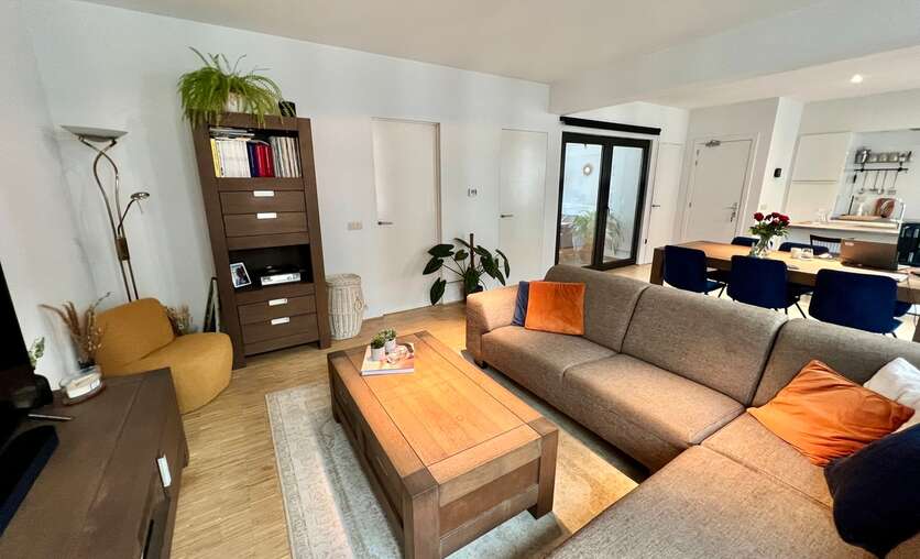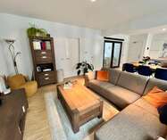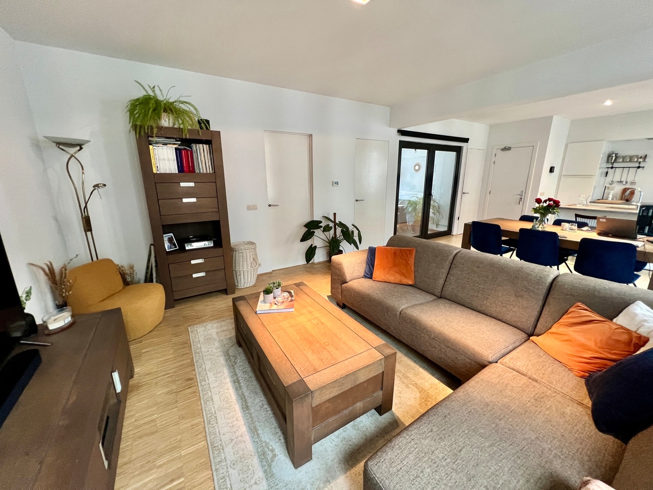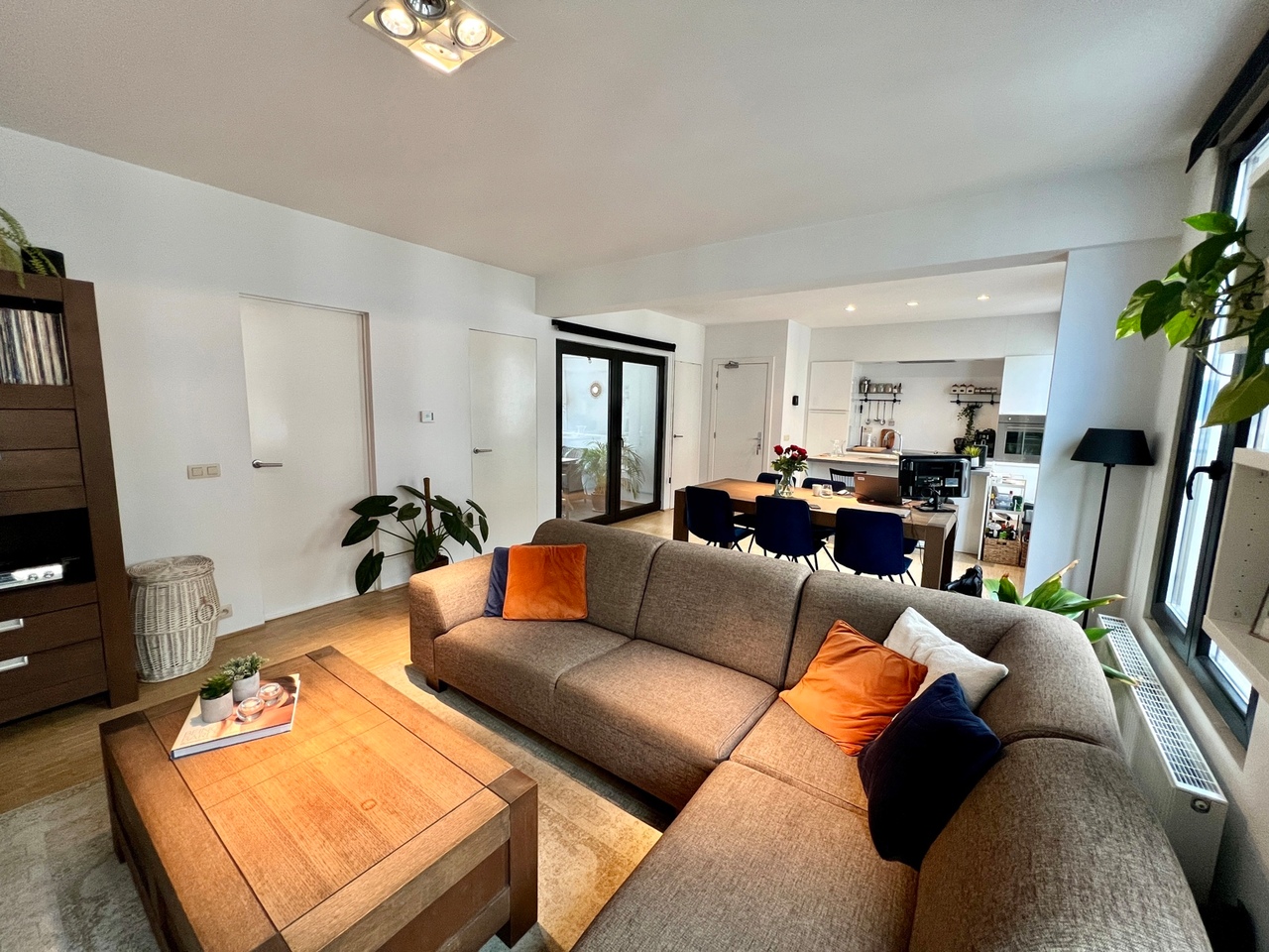 Aansluitend aan de eetruimte en de open keuken bevindt zich de leefruimte.