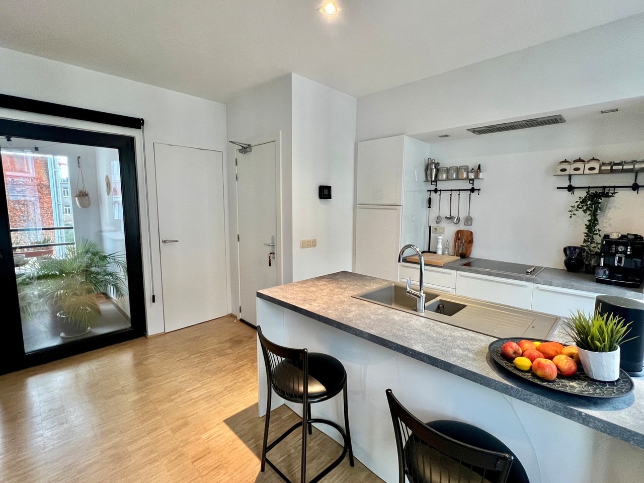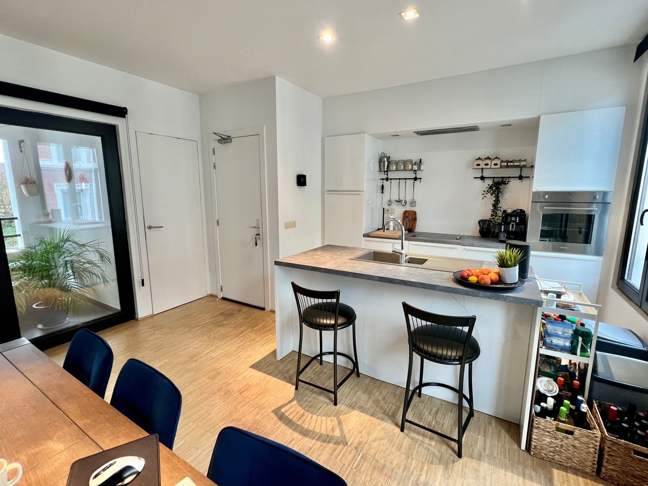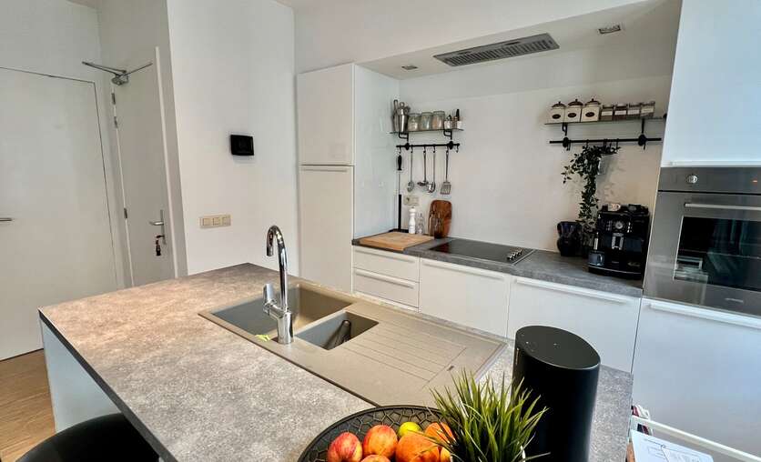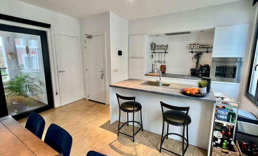 De keuken biedt via een dubbel opendraaiende deur toegang tot het overdekt privé terras (4,33m2). Tevens is ook de berging hiernaast gelegen met voorzieningen voor wasmachine en droogkast.