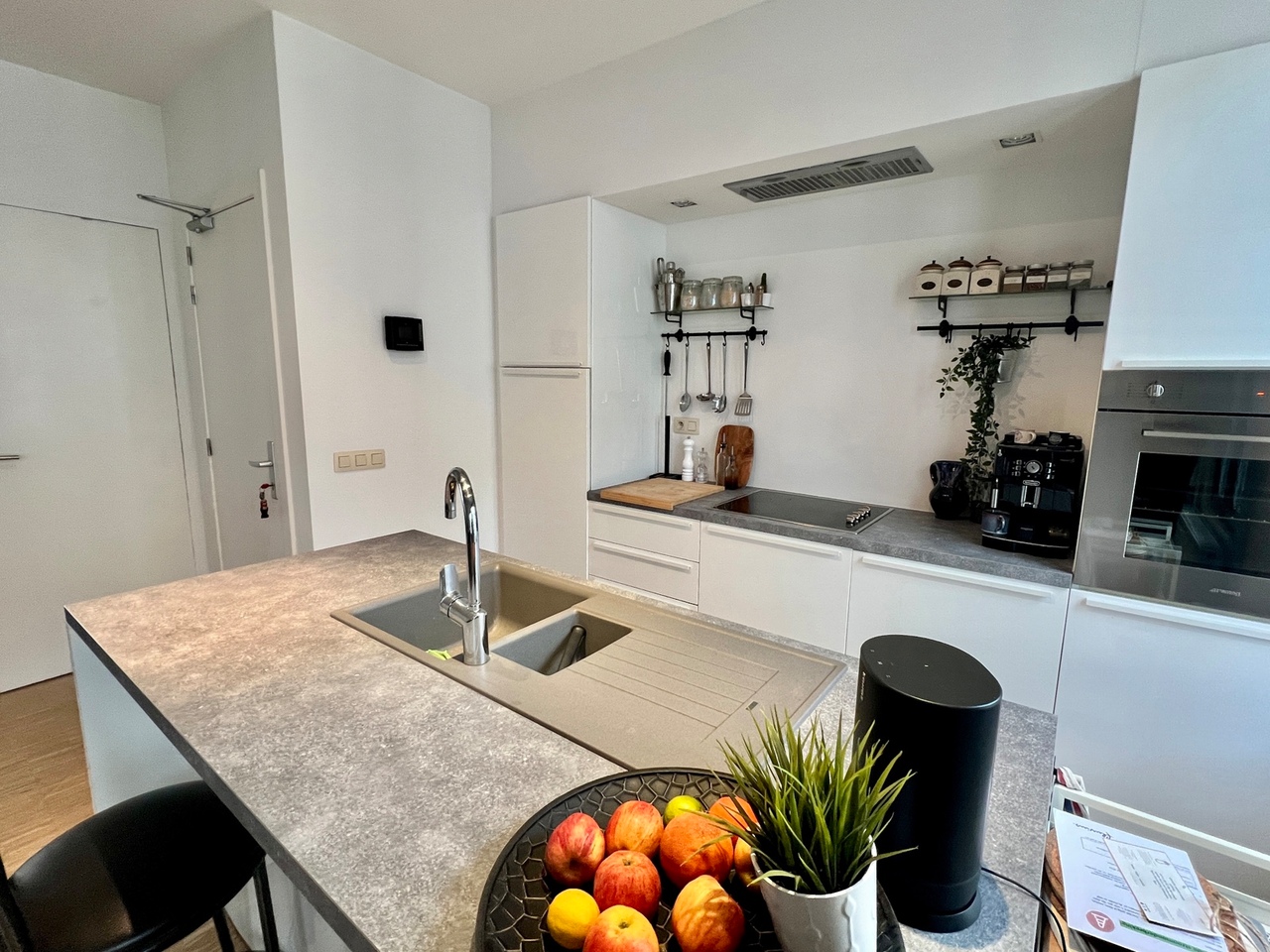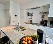In de keuken zelf zijn voorzieningen zoals vaatwasser, oven, geïntegreerde dampkap, keramische kookplaat, koelkast met vriesvak; spoelbak en ingebouwde kasten.