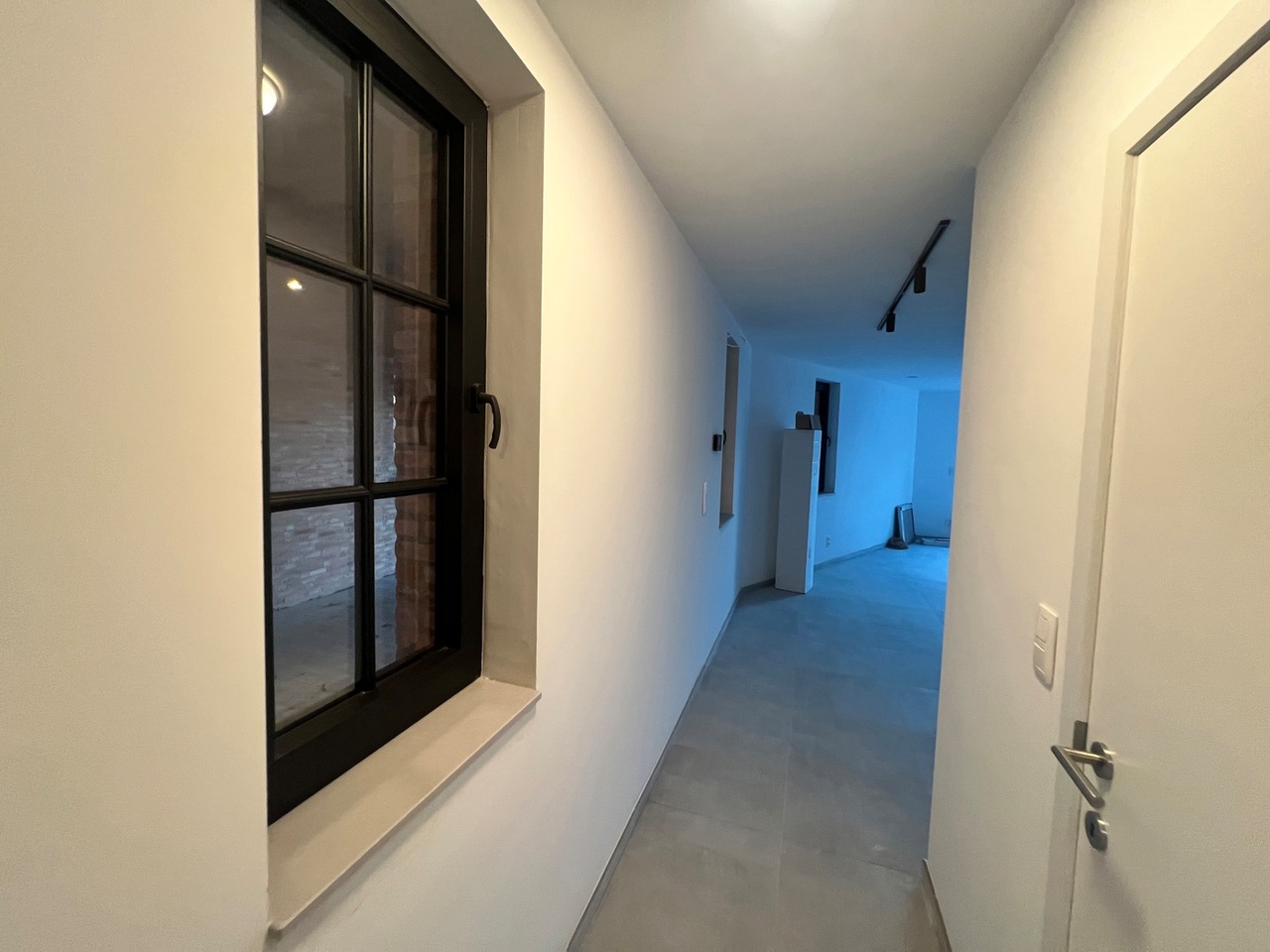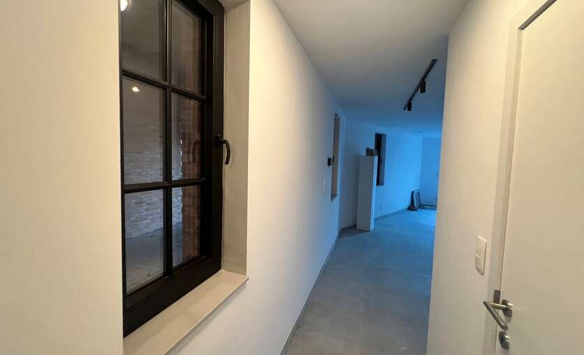 In de hal vinden enerzijds de doorgang tot de leefruimte, anderzijds tot de 1 ruime slaapkamer en badkamer.
