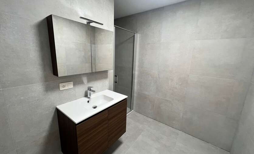De badkamer is ingericht met inloopdouche en dubbel lavabomeubel.