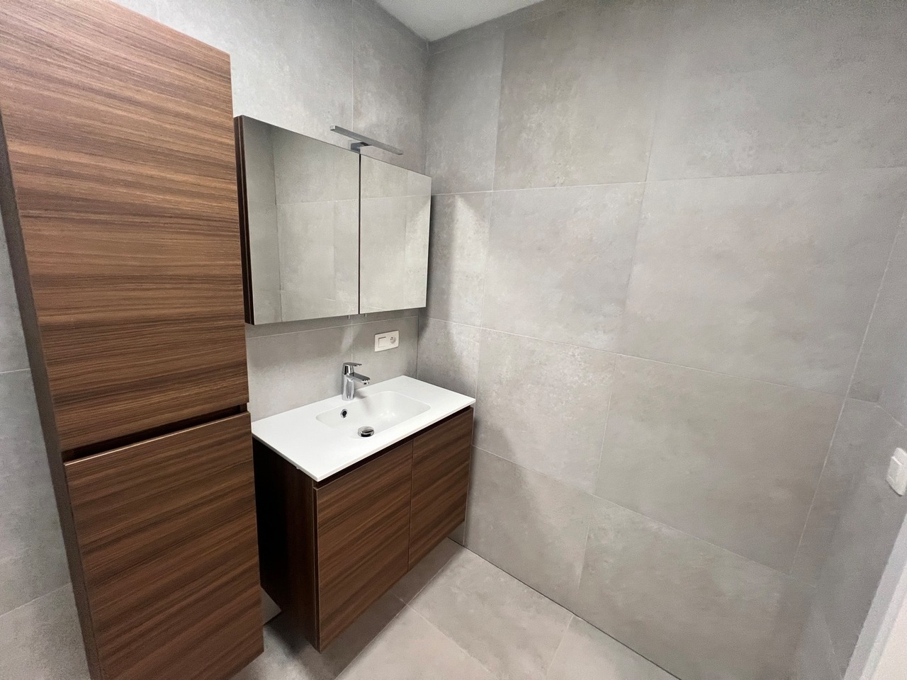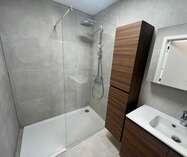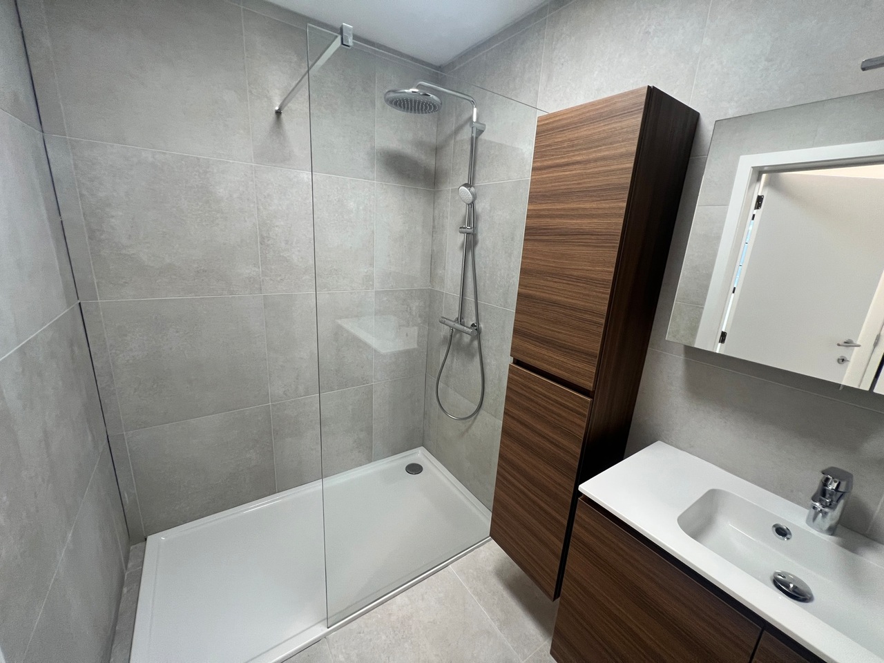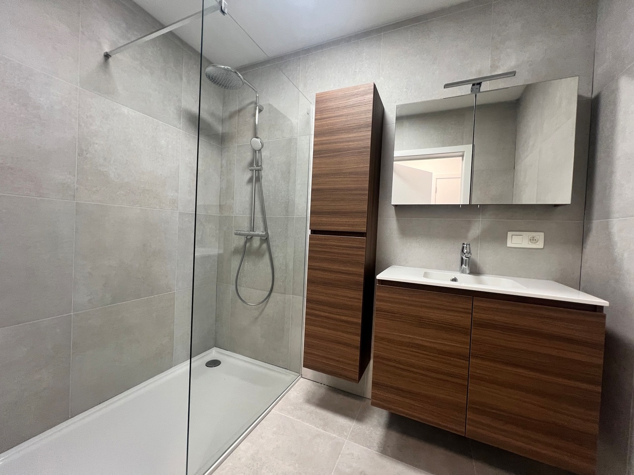 De badkamer is ingericht met inloopdouche en dubbel lavabomeubel.