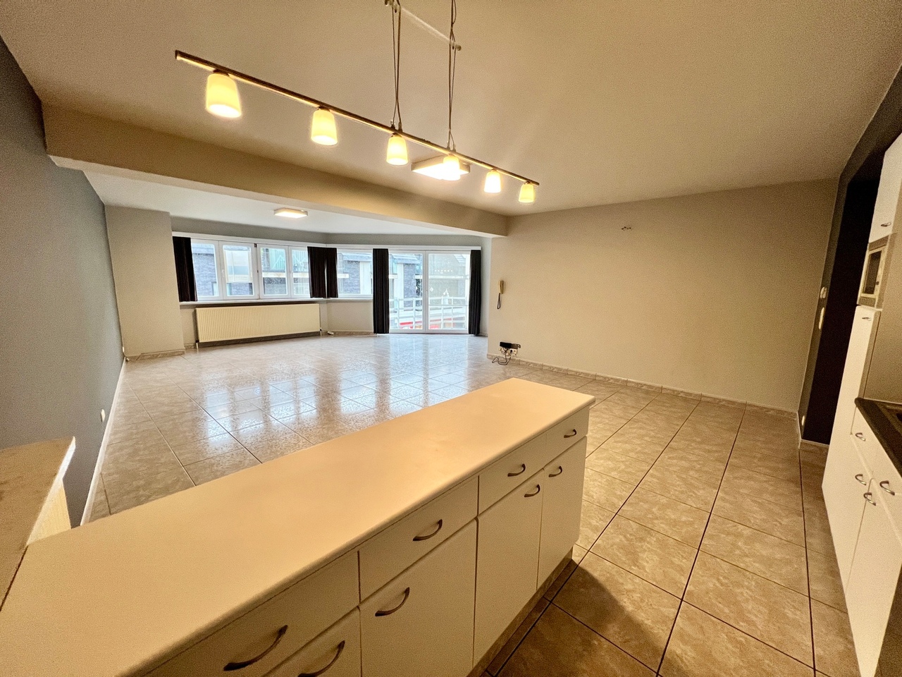 De grote leefruimte geniet van een aangename lichtinval en een open ingerichte keuken.
