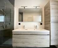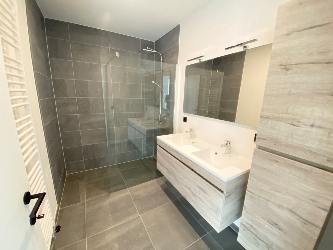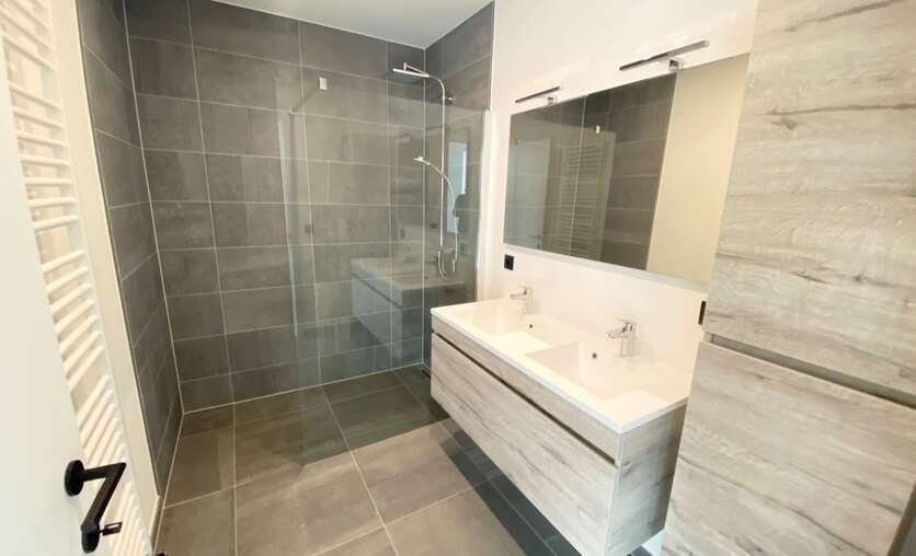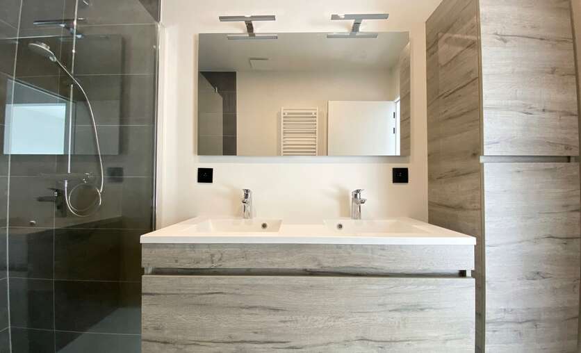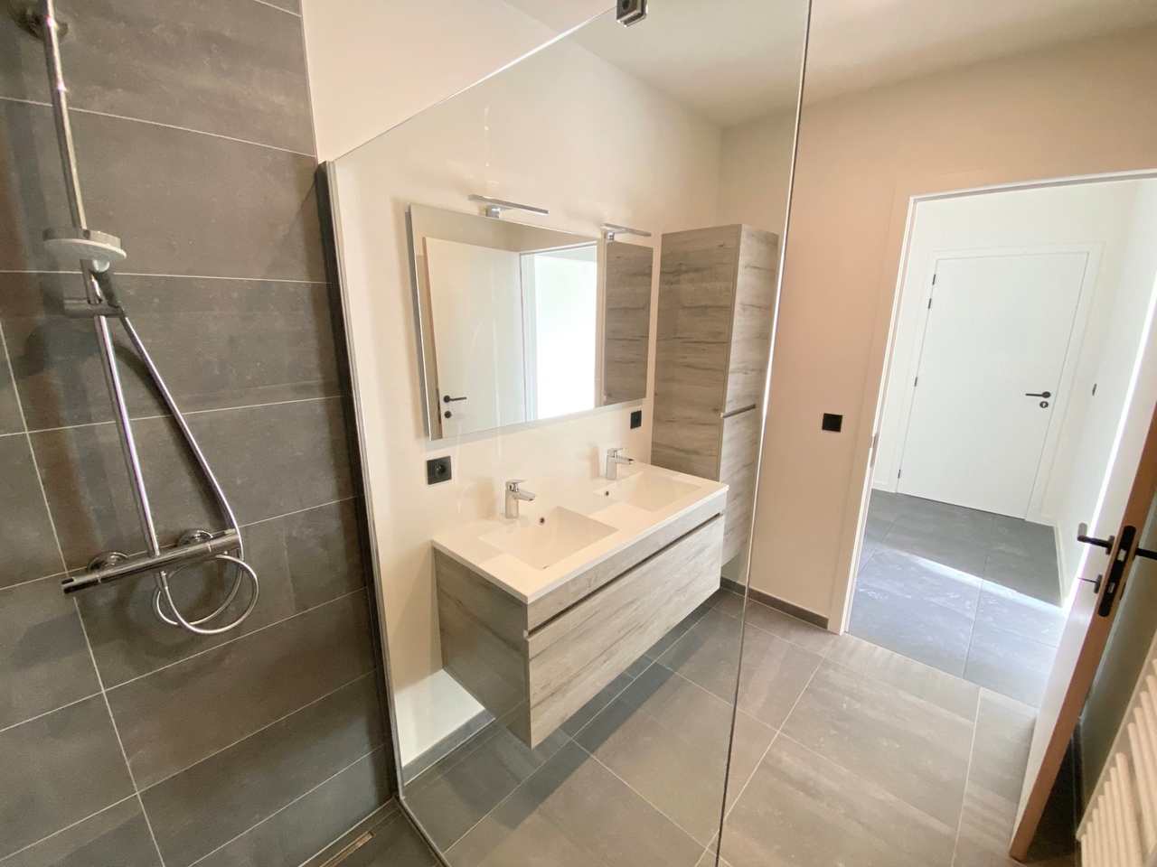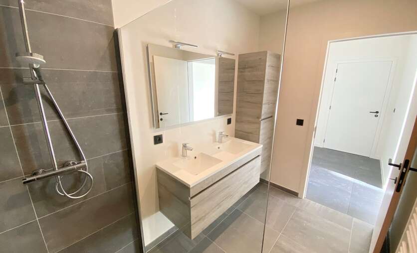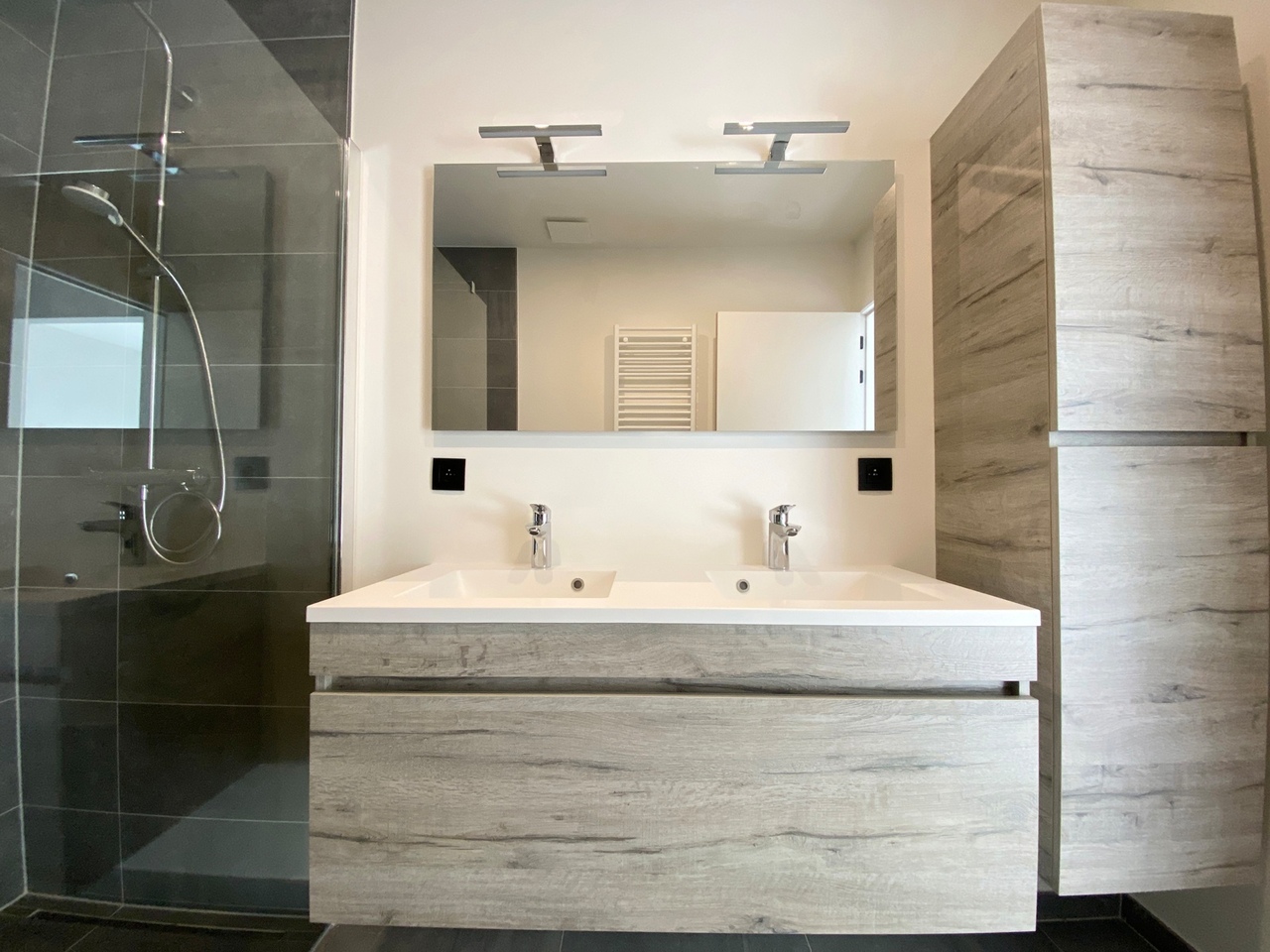 Terug in de hal vinden we enerzijds de badkamer, dewelke is ingericht met een dubbel lavabomeubel en een inloop/regendouche.