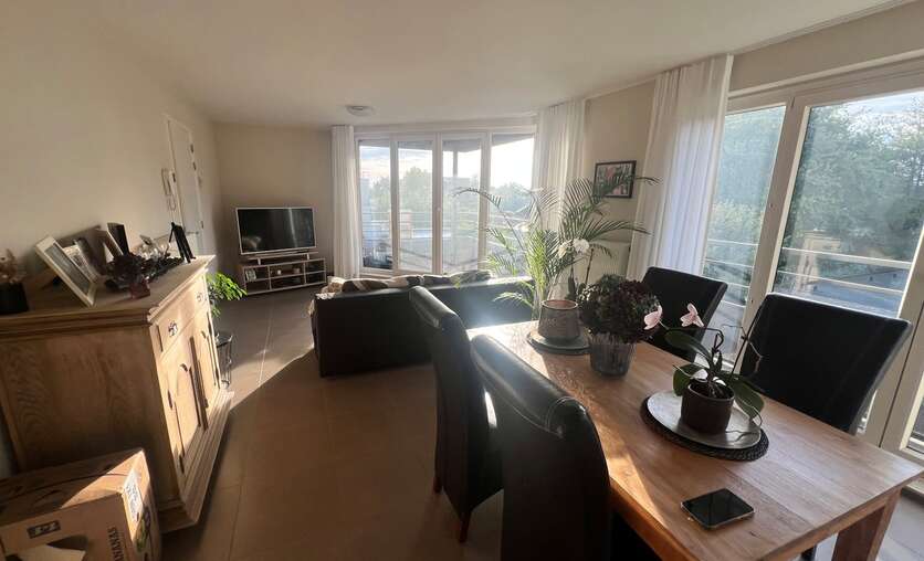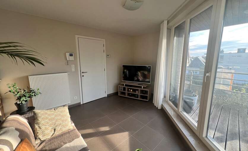 De leefruimte en zithoek genieten van een aangename lichtinval en hebben toegang tot het terras.