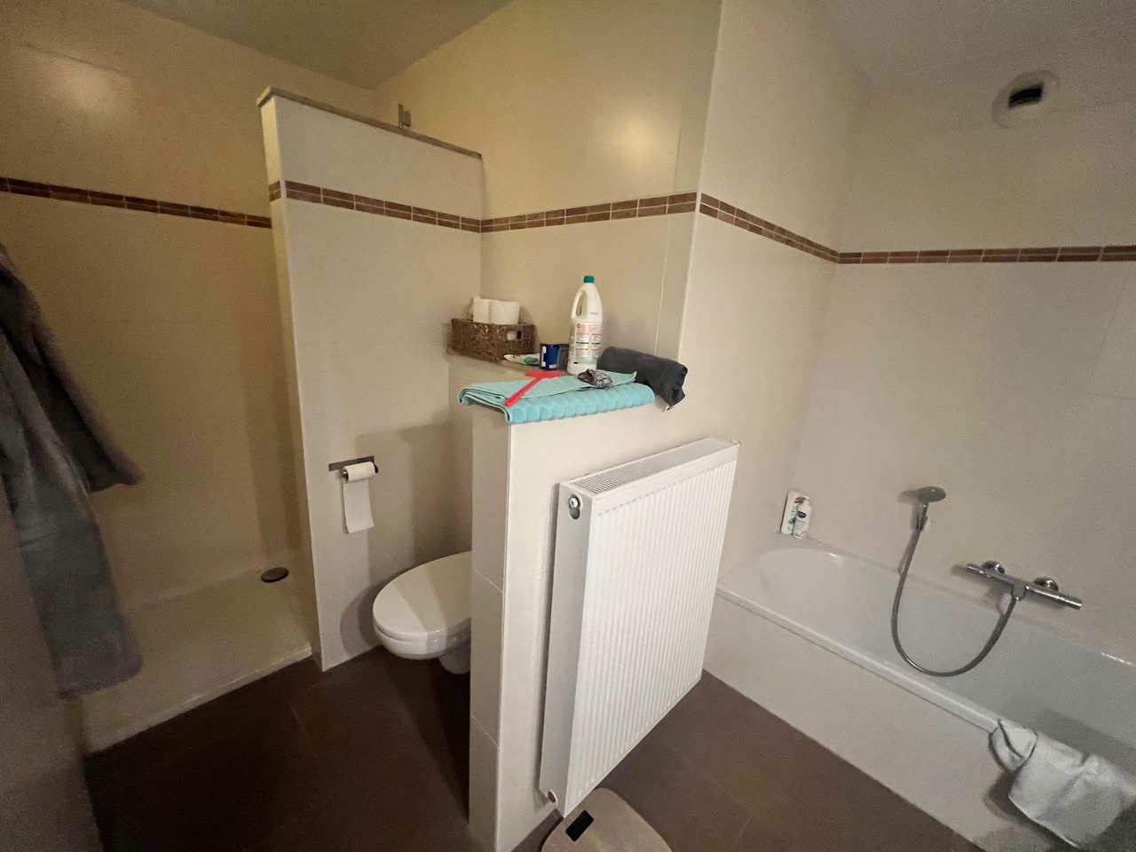 Ook de badkamer is hier gesitueerd en is ingericht met douche, ligbad, lavabomeubel en toilet.