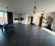 De leefruimte en zithoek met open keuken genieten van een aangename lichtinval en toegang tot het zonneterras achteraan en het terras vooraan.