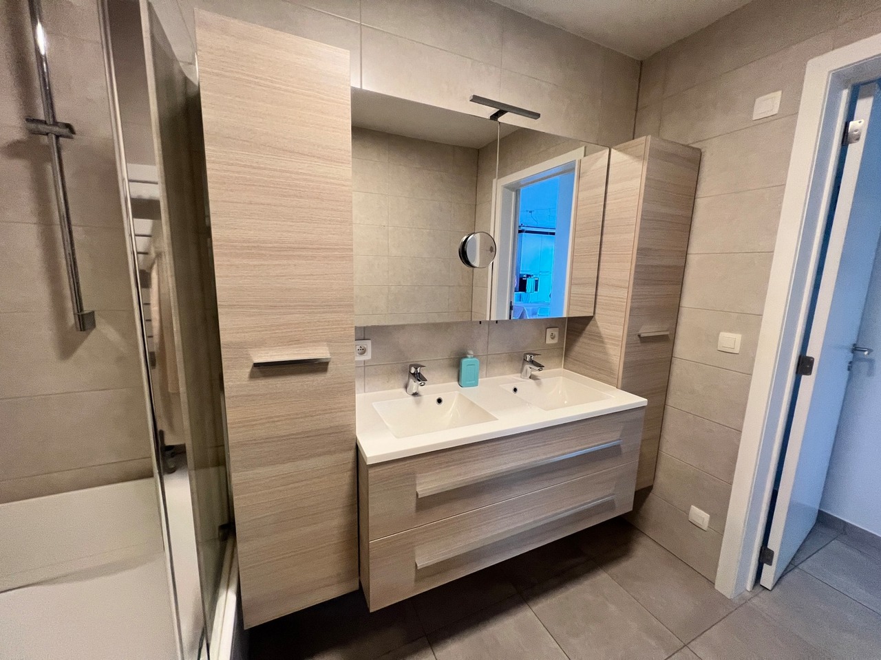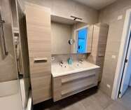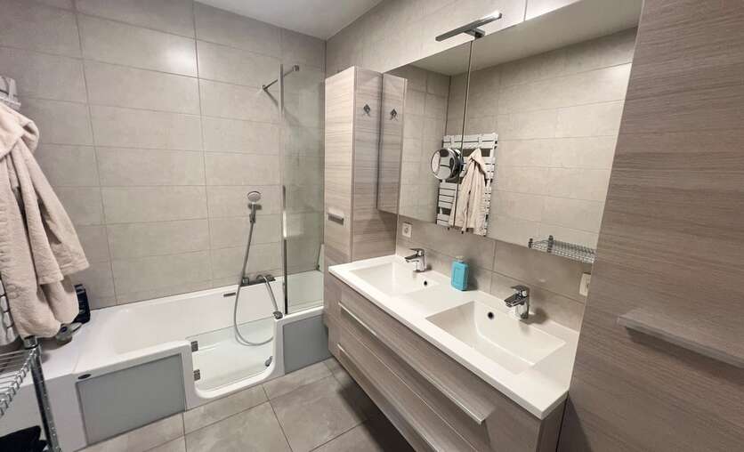 Langs de nachthal komen we in de badkamer, ingericht met dubbel lavabomeubel en ligbad met douchevoorziening.