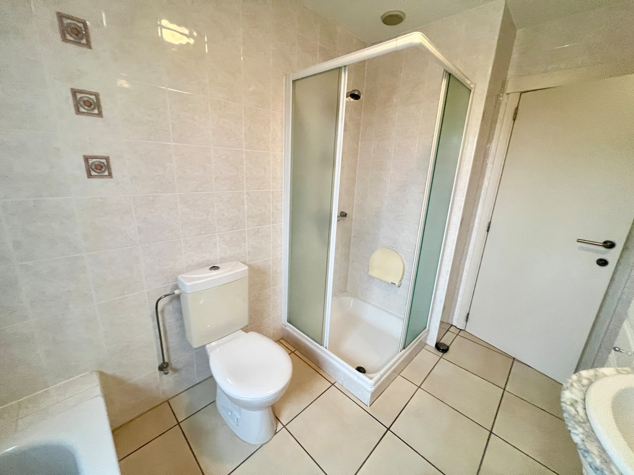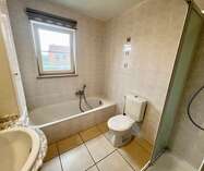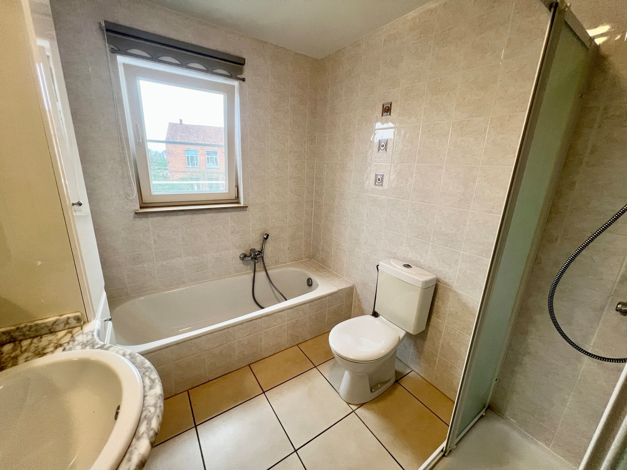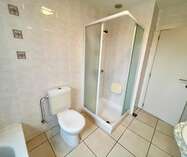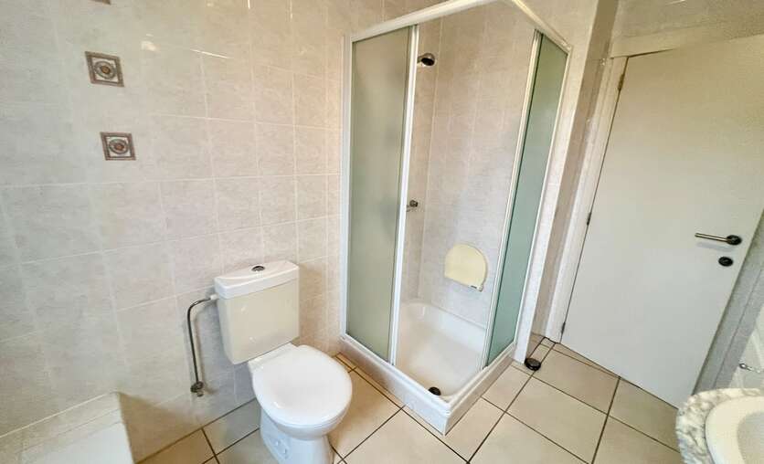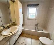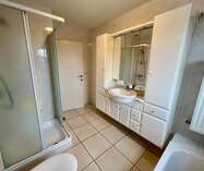 Terug in de hal is er de badkamer, ingericht met zowel ligbad als douche, toilet en lavabomeubel.