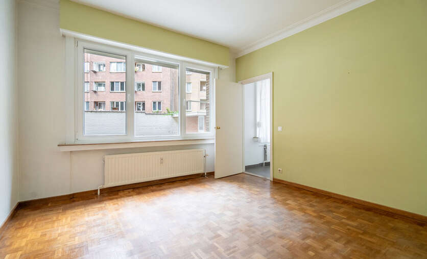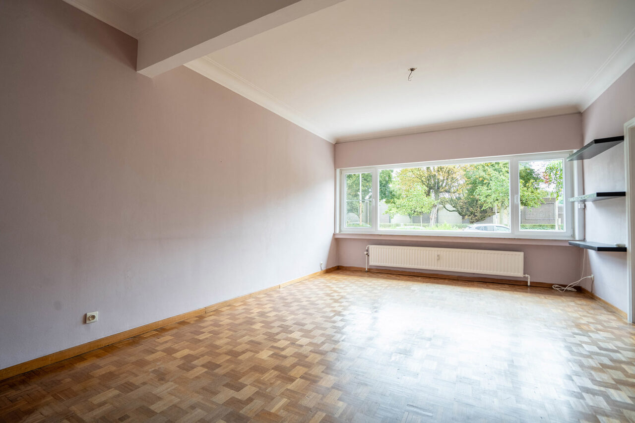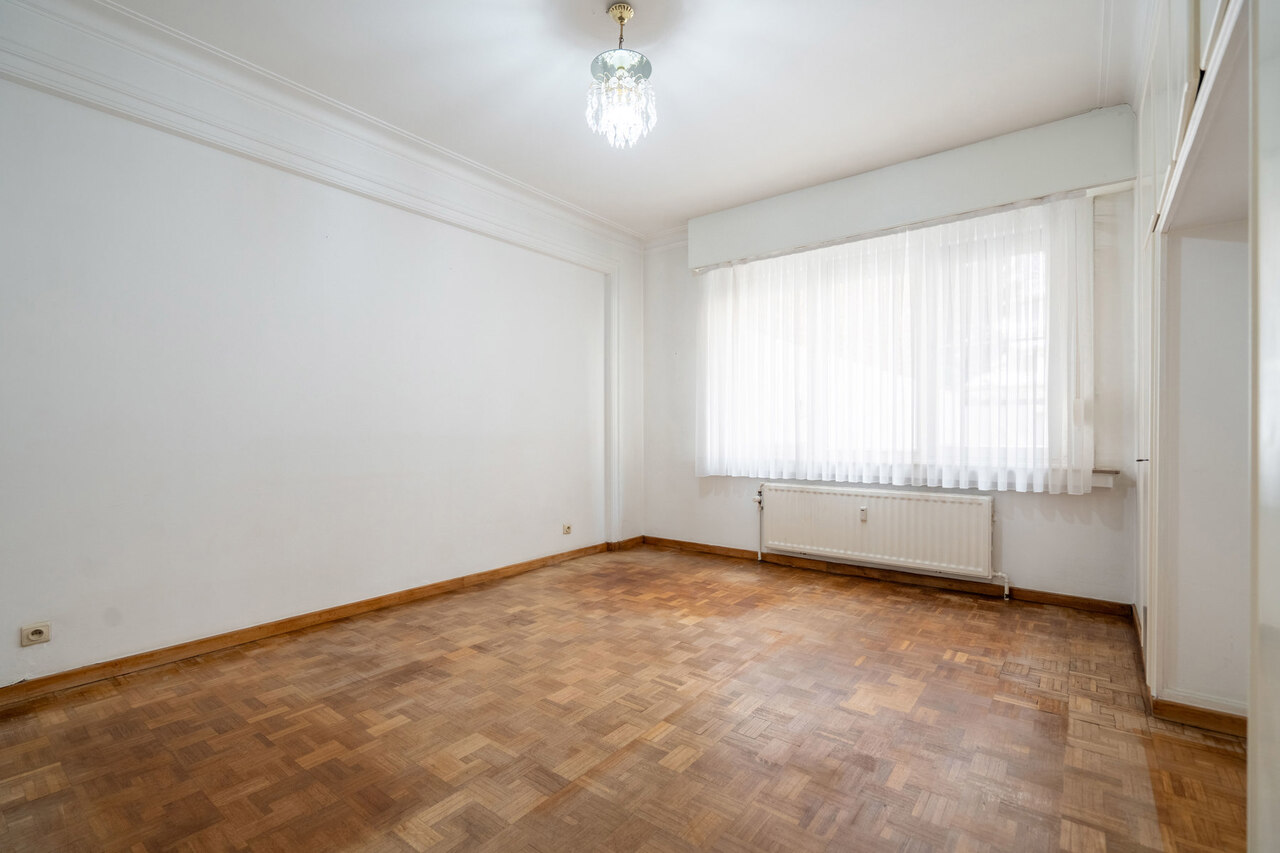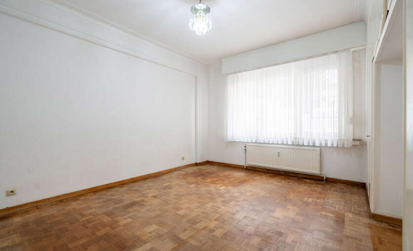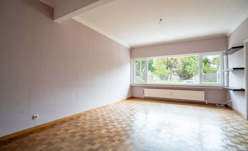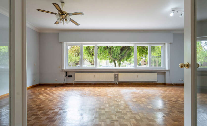 De leefruimte bevindt zich aan de voorzijde en geniet nog van een prachtige parketvloer en schouwmantel.
