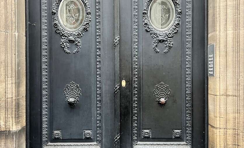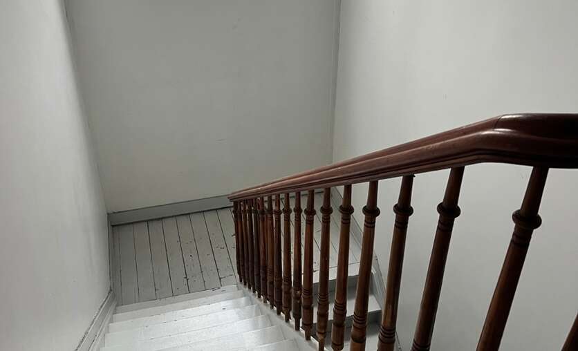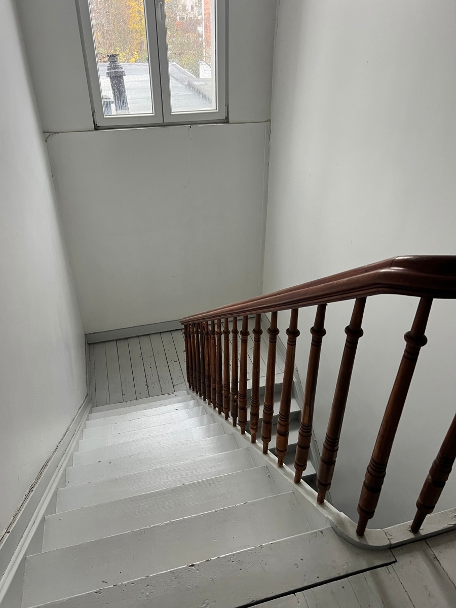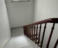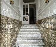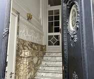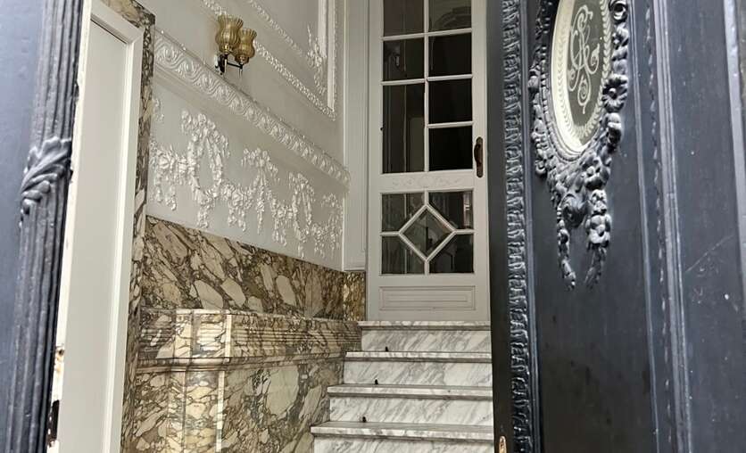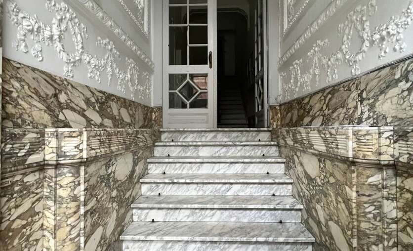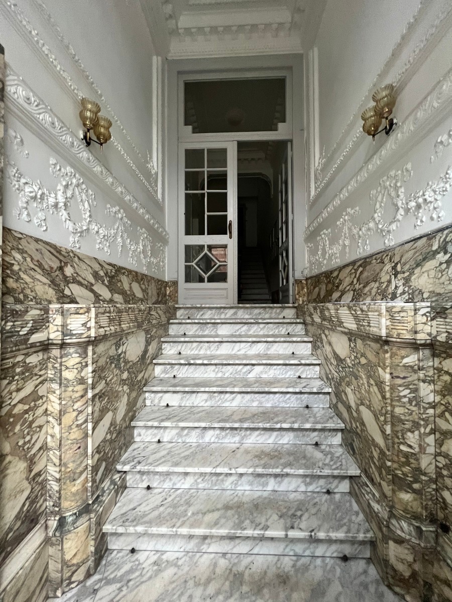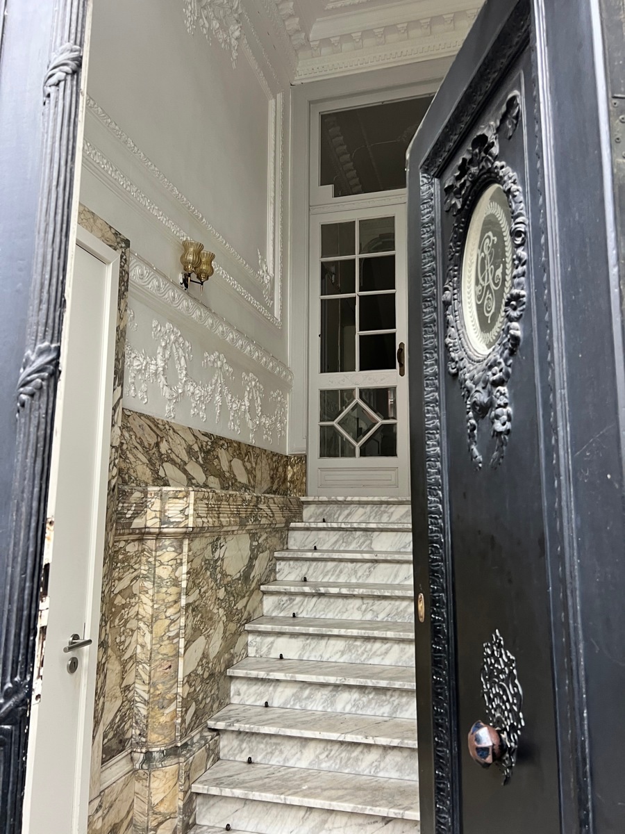 Via de magnifieke traphal komen we tot de bovenste etage, waar we de toegang vinden tot het appartement.