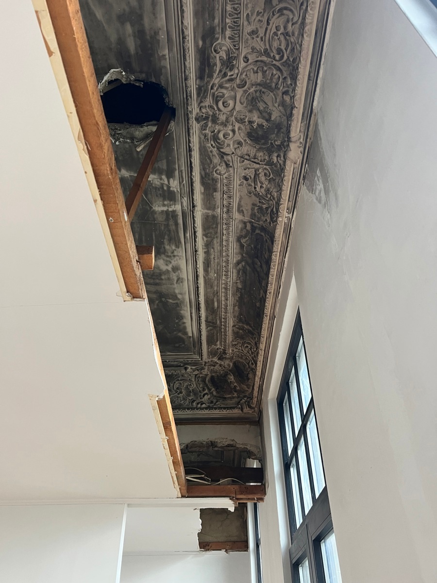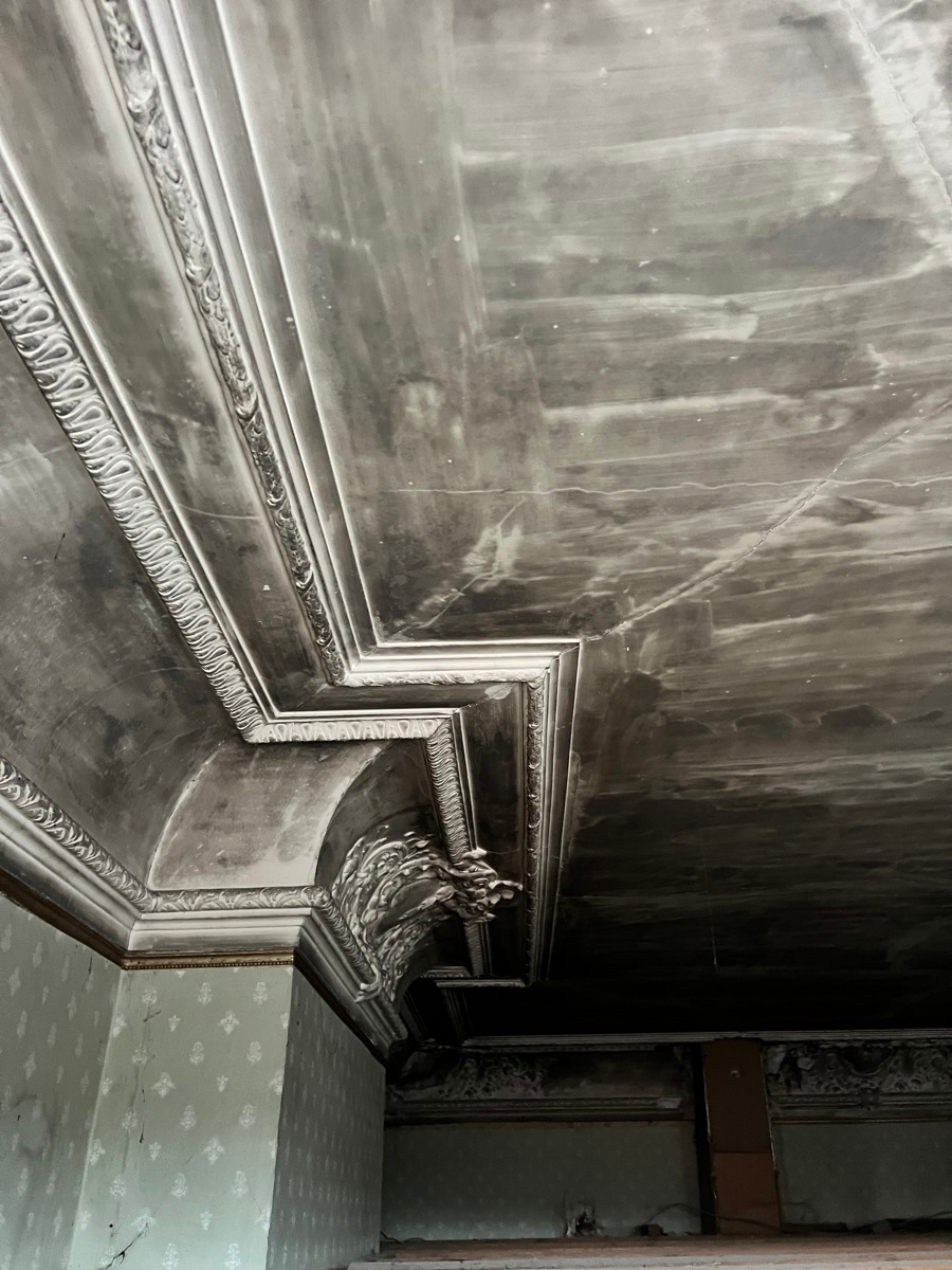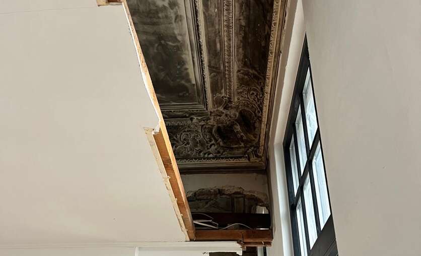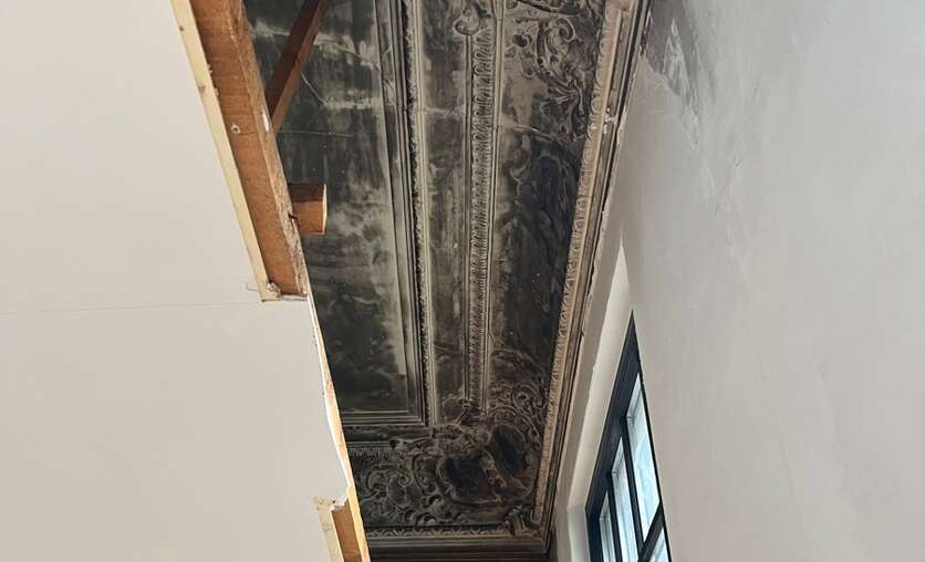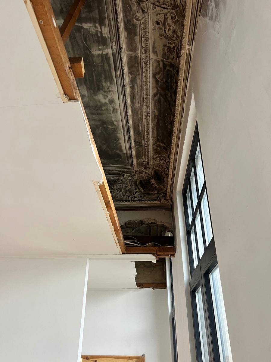 Boven achter de valse plafonds zijn de originele plafonds nog zichtbaar, prachtig voor wie een authentiek karakter wenst terug te brengen in zijn eigendom.