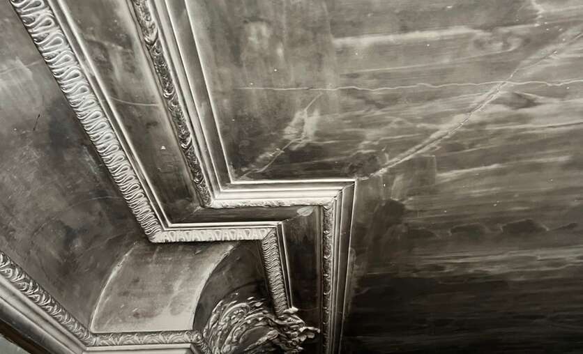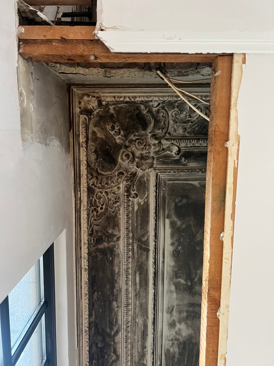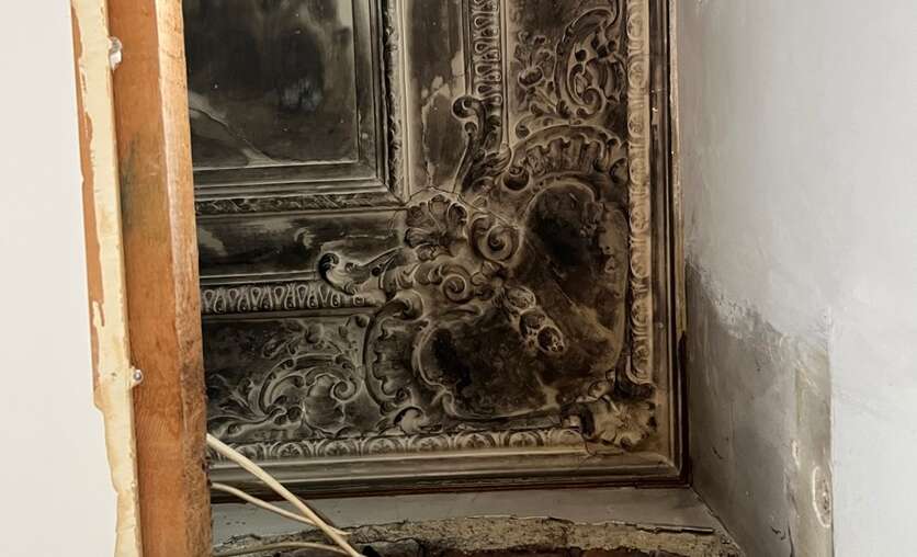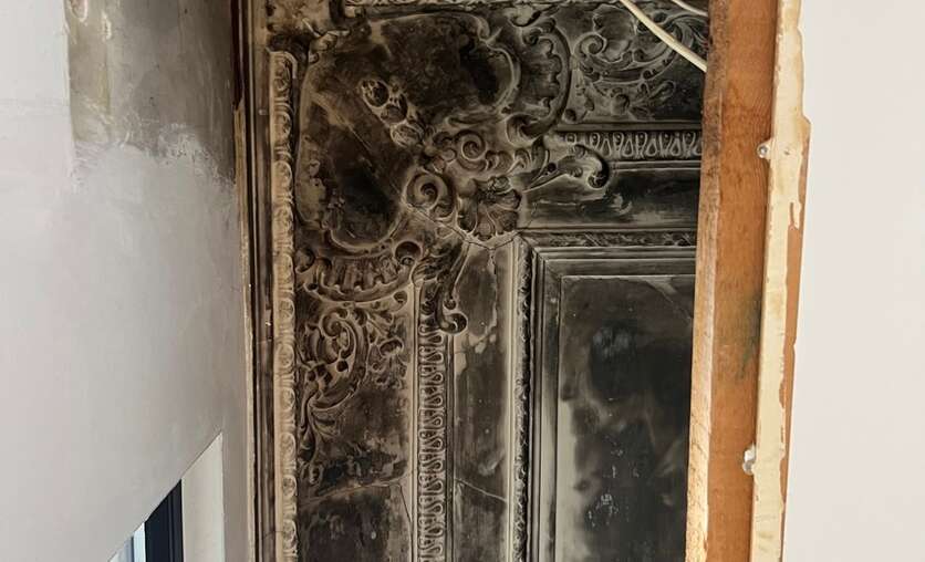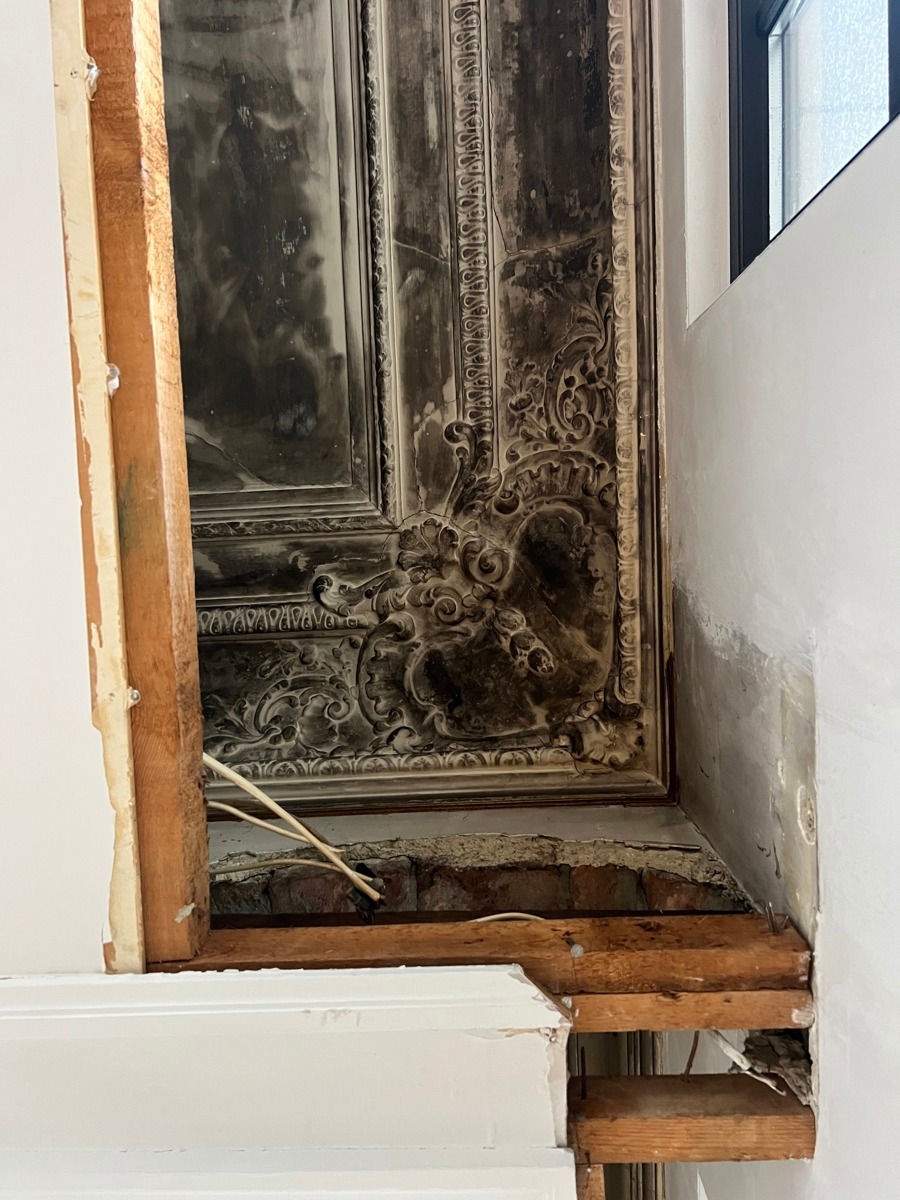 Boven achter de valse plafonds zijn de originele plafonds nog zichtbaar, prachtig voor wie een authentiek karakter wenst terug te brengen in zijn eigendom.