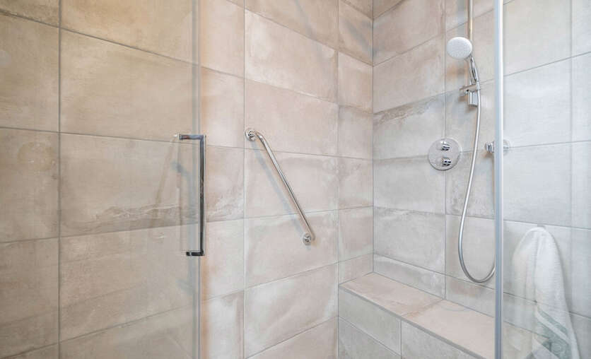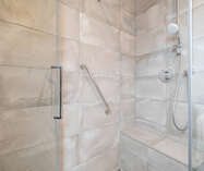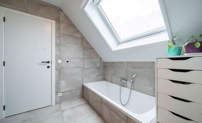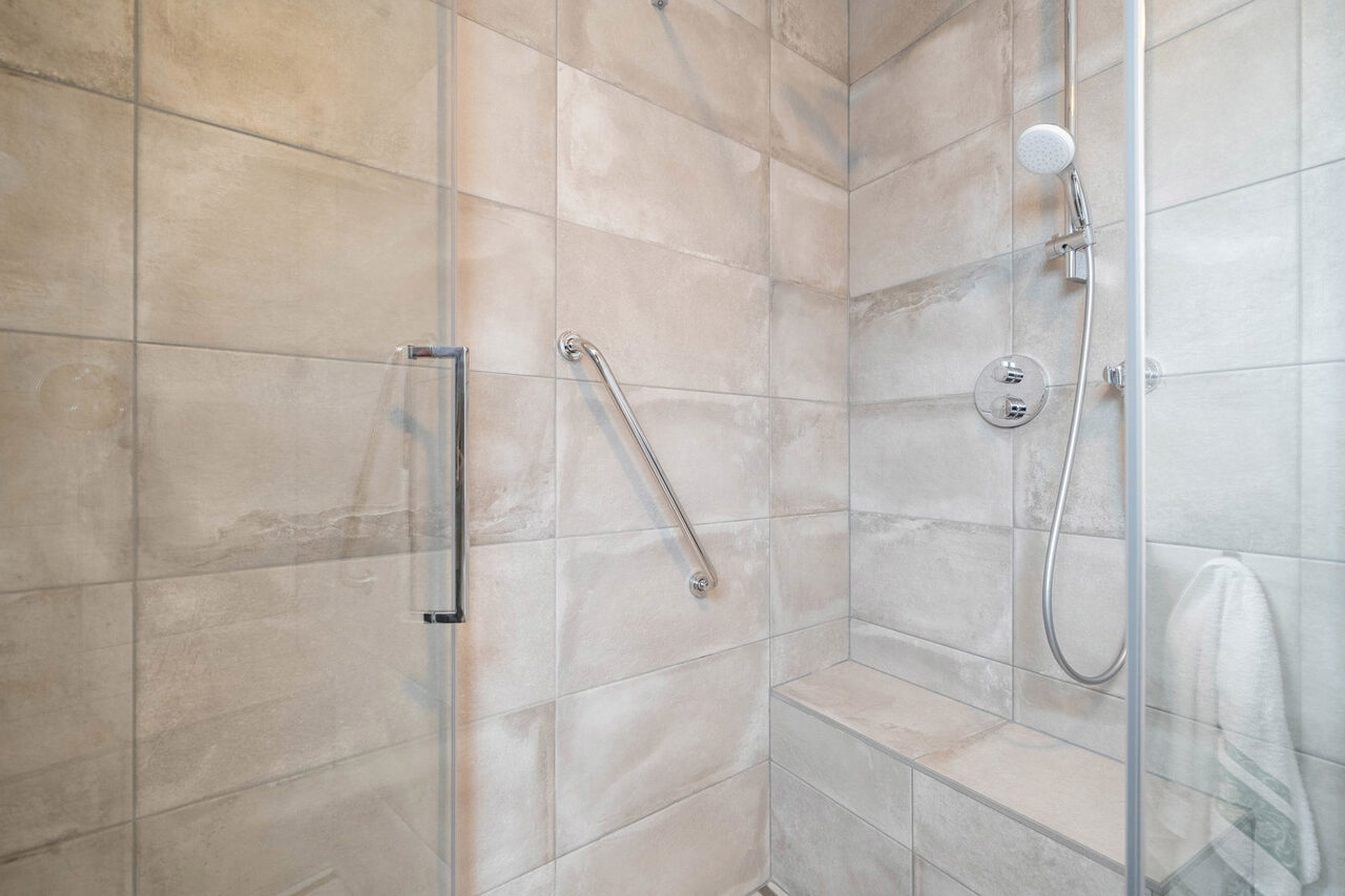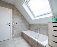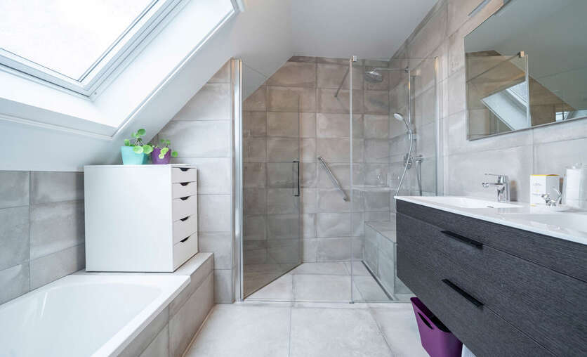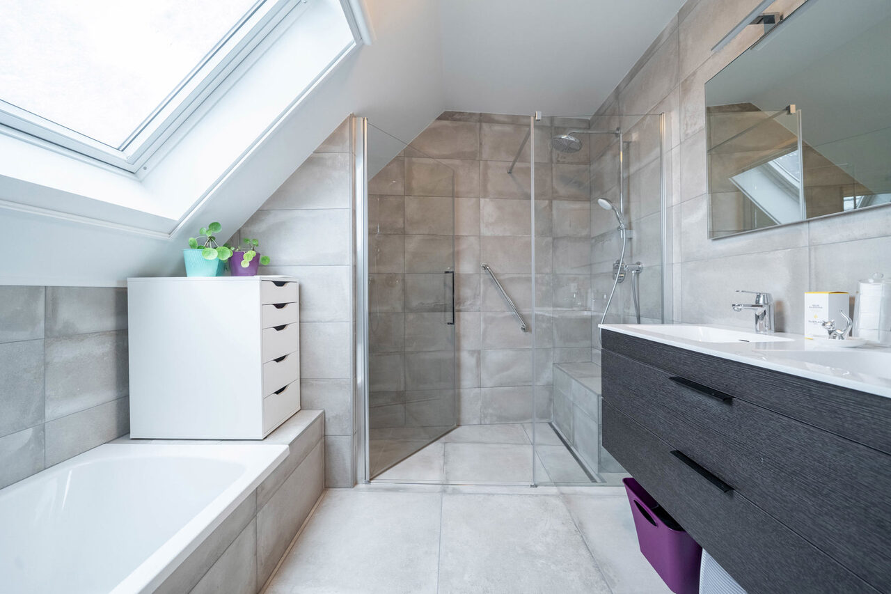 Anderzijds is er de badkamer met inloop/regendouche en lavabomeubel.