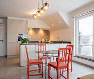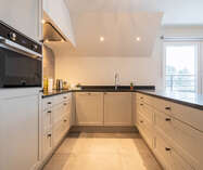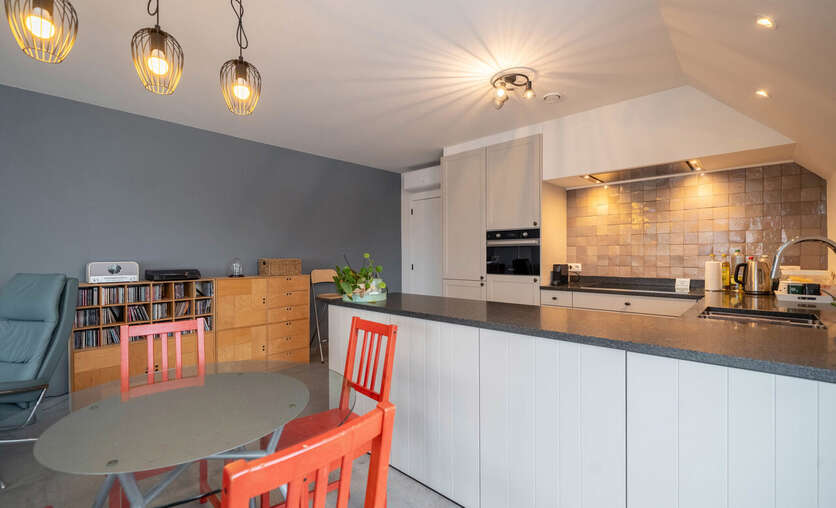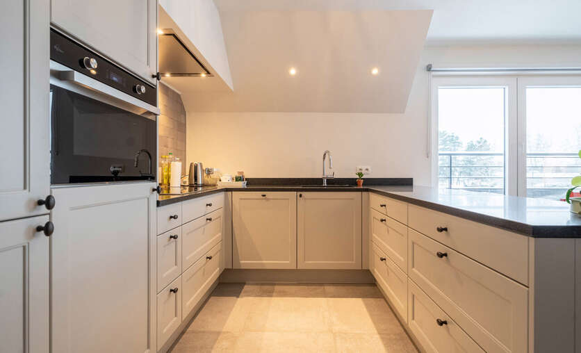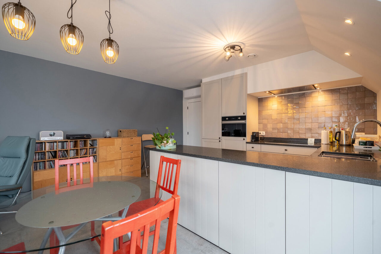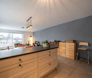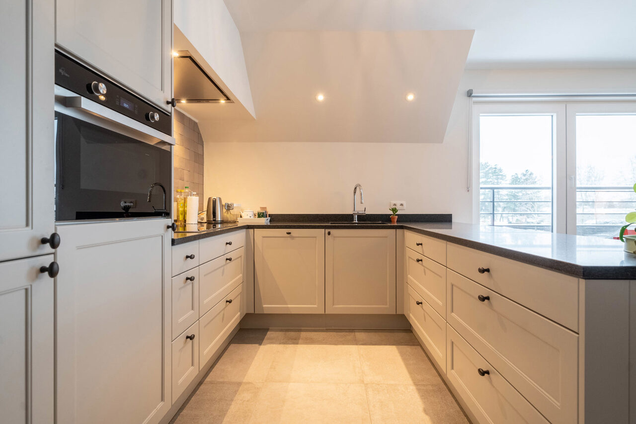 De maatwerkkeuken zelf is uitgerust met de nodige toestellen zoals vaatwasser, spoelbak, ijskast, inductie kookvuur, combi-oven, ...