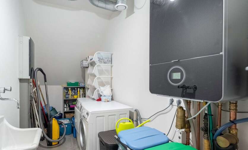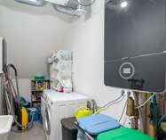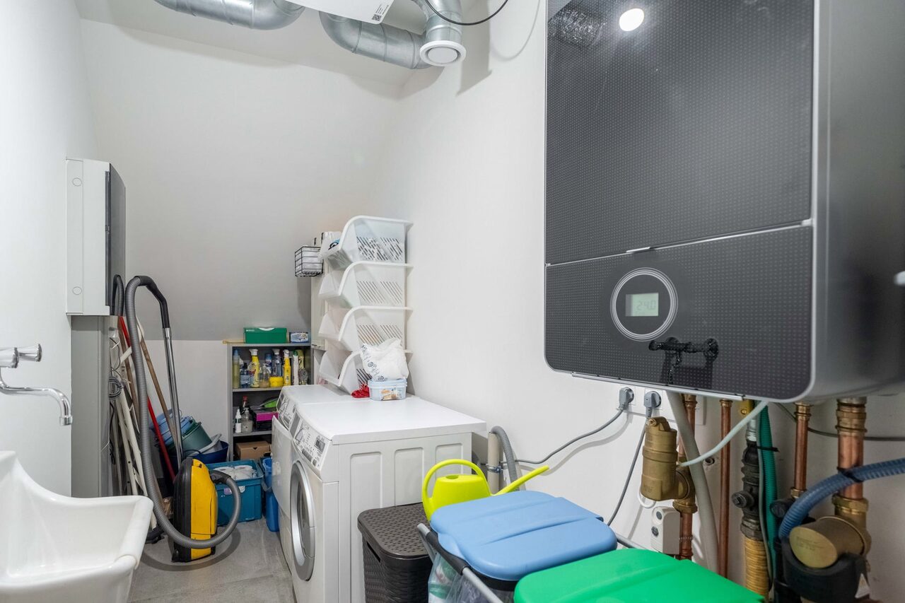 Aansluitend op de leefruimte is er een grote berging met uitgietbak en de nodige aansluitingen voor wasmachine/droogkast.