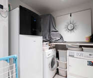 De hal van het appartement geeft enerzijds toegang tot het gastentoilet en de berging dewelke allen voorzien zijn van praktische inbouwkasten alsook aansluiting voor wasmachine en droogkast wat de berging betreft.