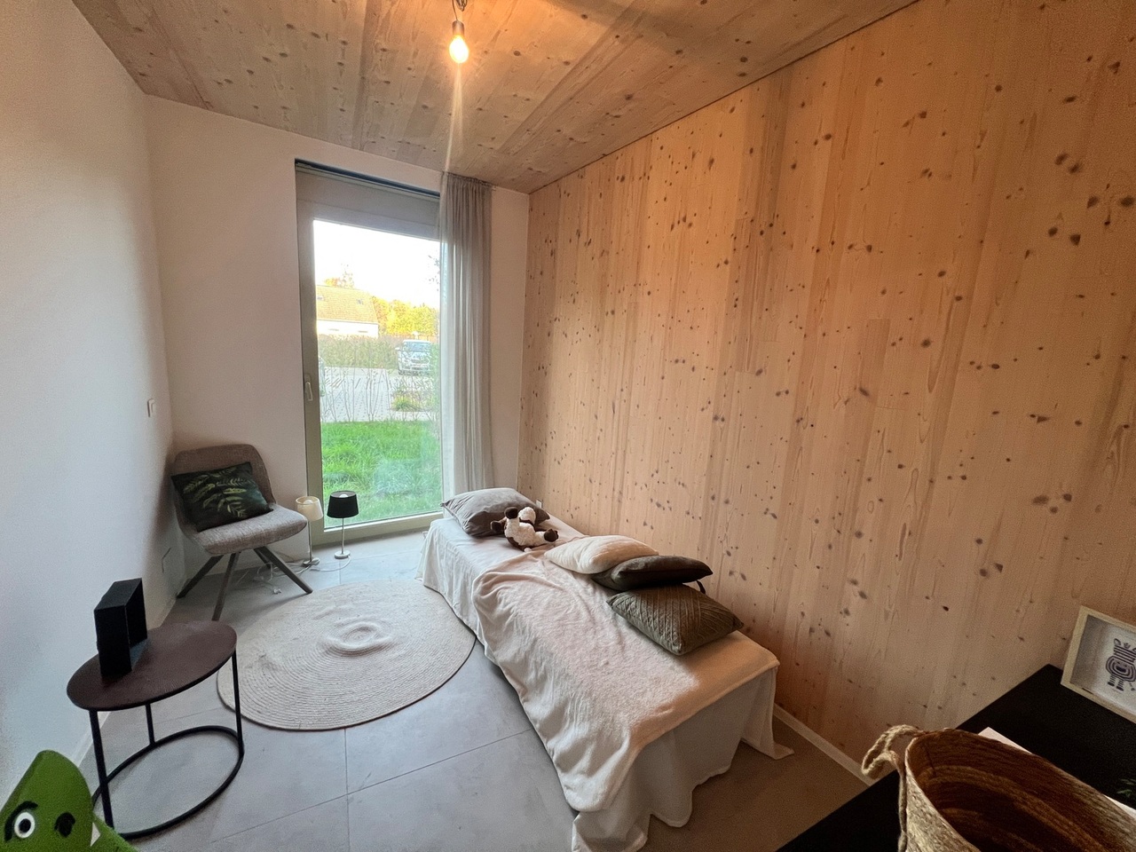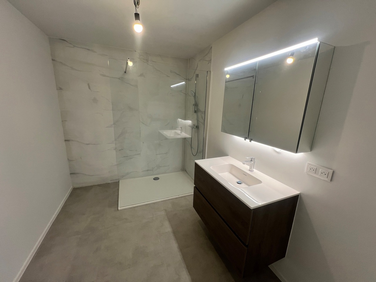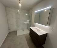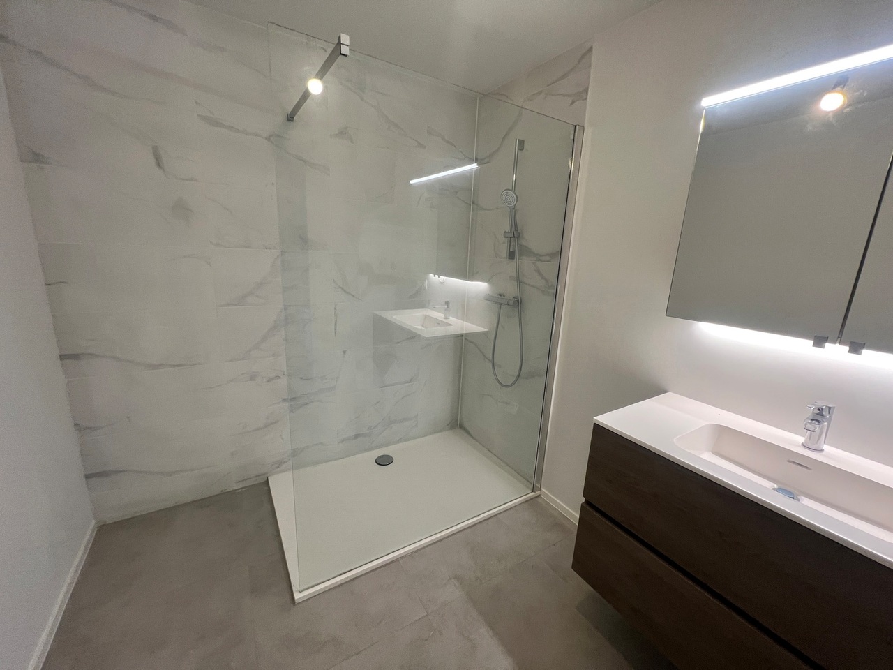 Aan de achterzijde in alle rust, liggen de 2 slaapkamers alsook de ruime badkamer met inloopdouche en lavabomeubel.