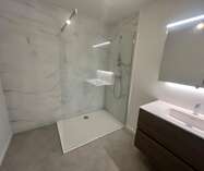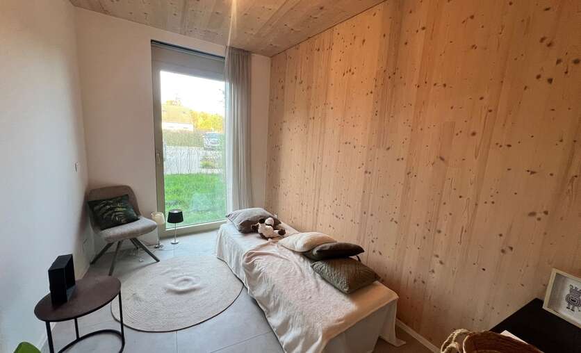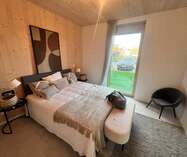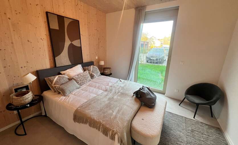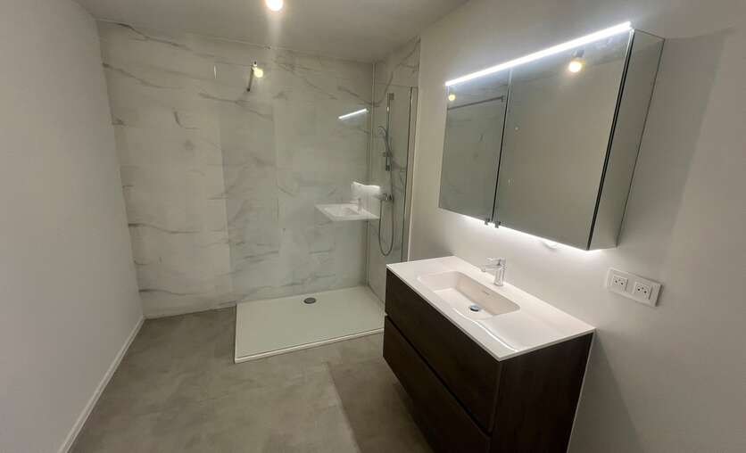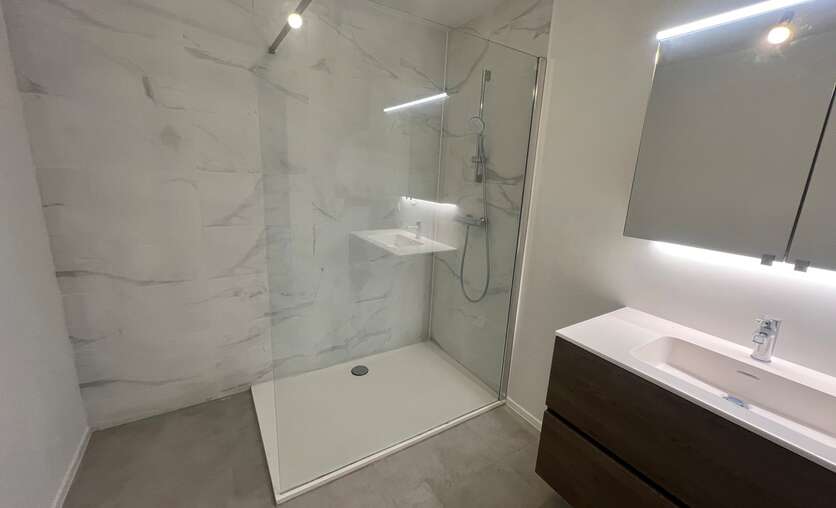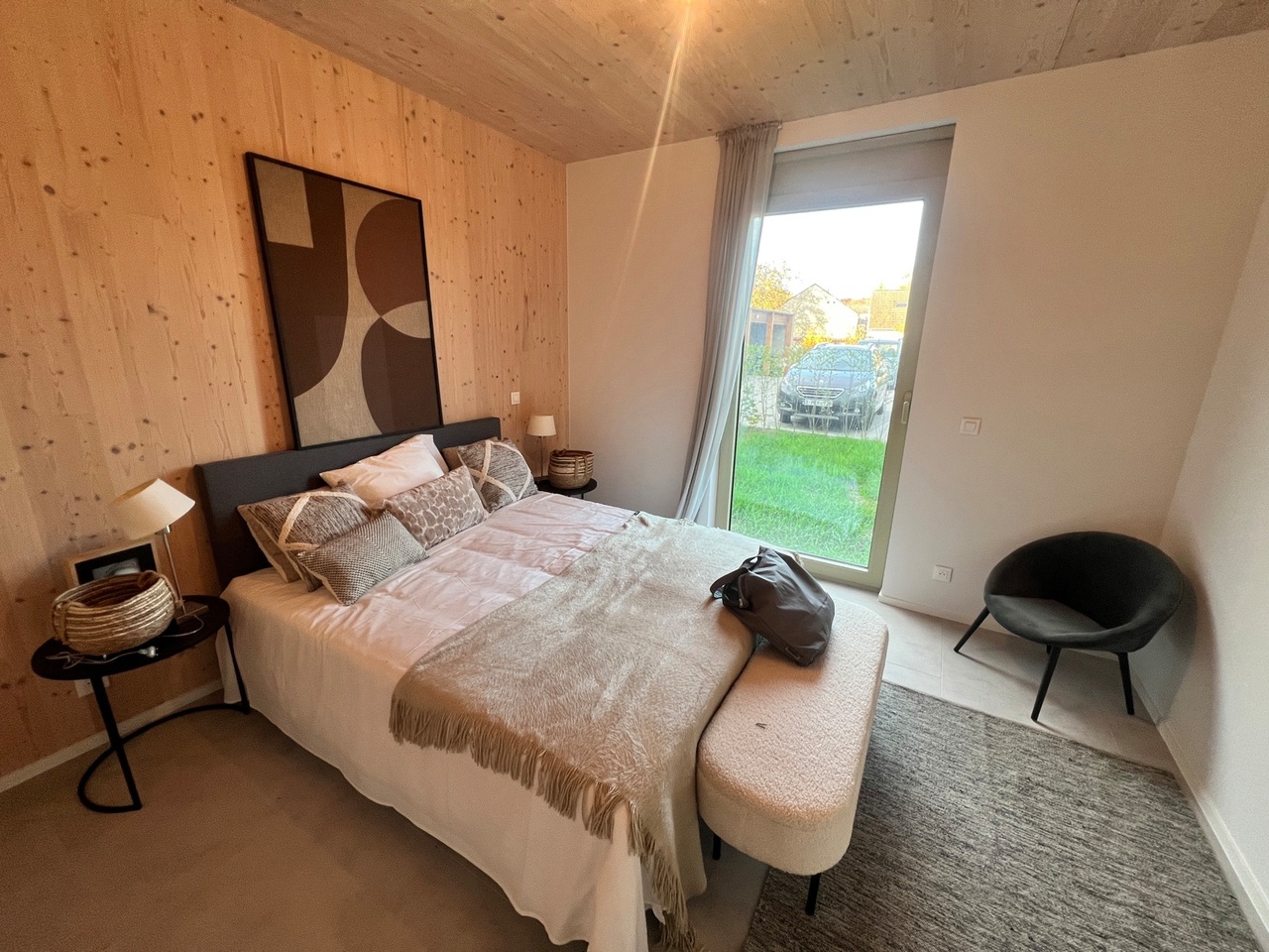 Aan de achterzijde in alle rust, liggen de 2 slaapkamers alsook de ruime badkamer met inloopdouche en lavabomeubel.