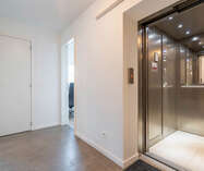 Via de gemeenschappelijke inkom komen we met de lift rechtstreeks in de ruime hal van het appartement.