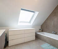 Terug in de hal is er de grote slaapkamer met ensuite badkamer, voorzien van ligbad en lavabomeubel.
