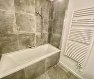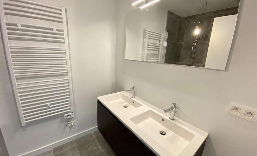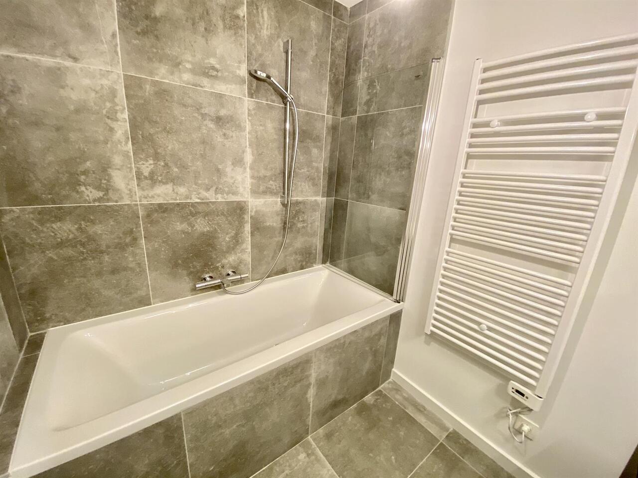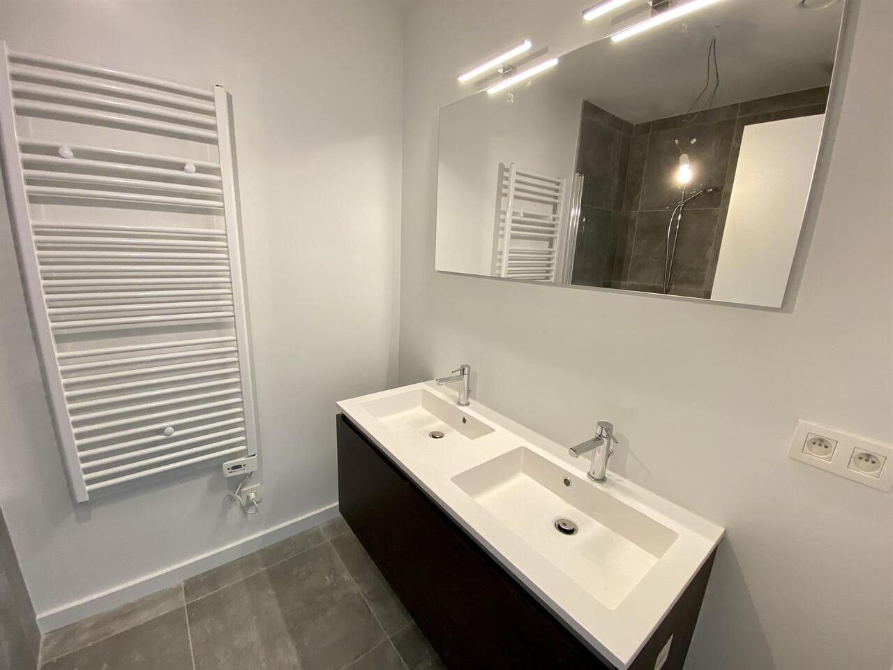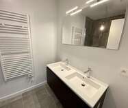 Terug langs de hal vinden we enerzijds de badkamer voorzien van ligbad met douchemogelijkheden en dubbel lavabomeubel.