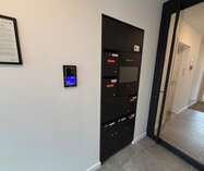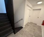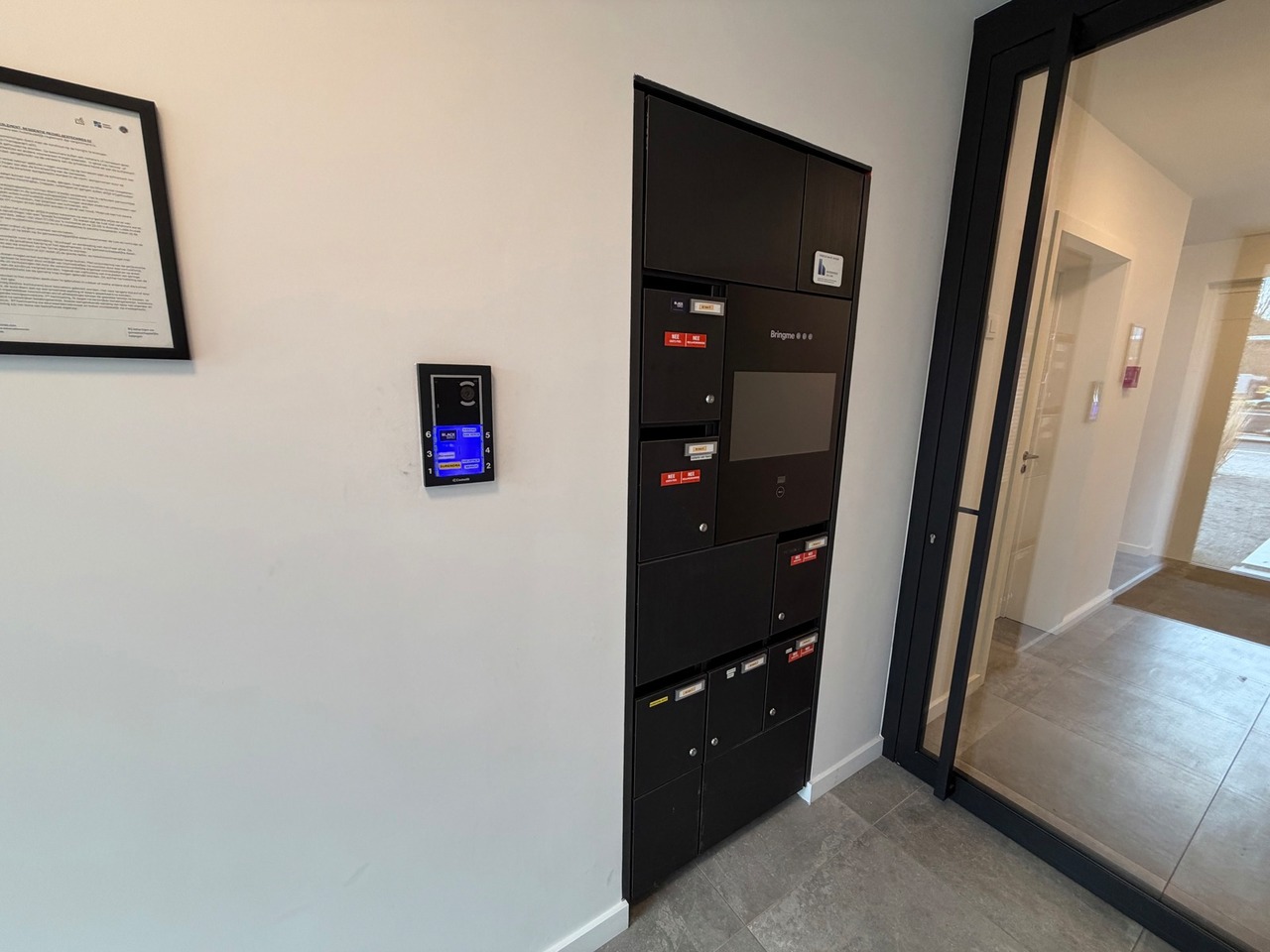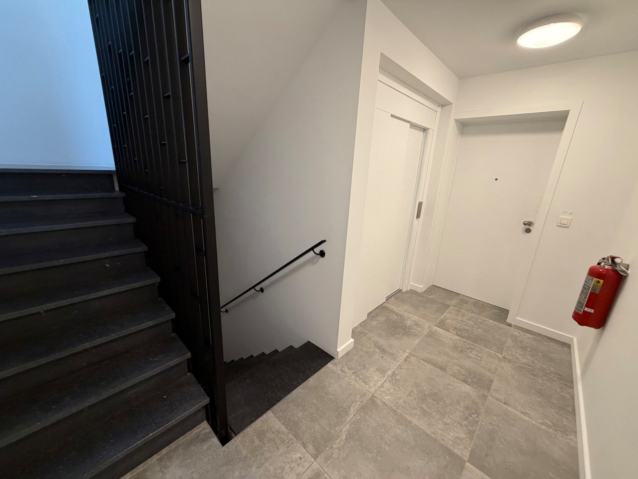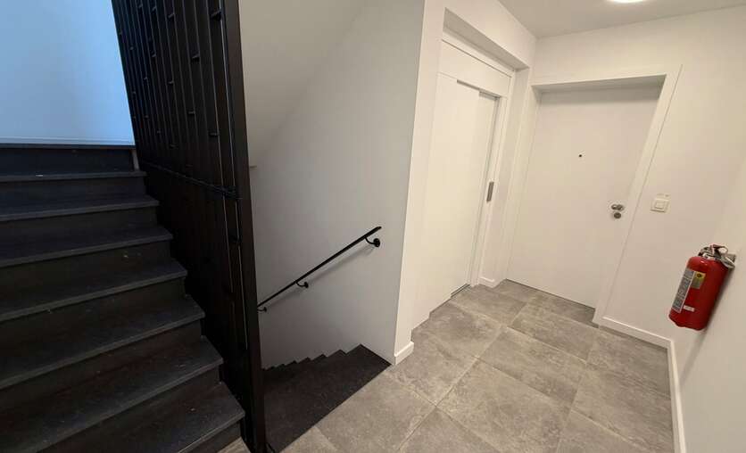 Langs de trap of lift komen we op de eerste verdieping, aan de inkom van het appartement.
