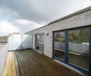 De leefruimte met zithoek geniet van een aangename lichtinval en biedt een aangenaam zicht op het ruime terras, waar u in alle rust kan genieten.