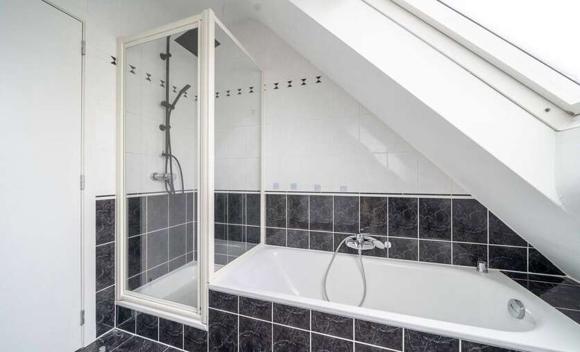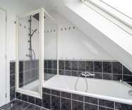 De badkamer beschikt over een lavabomeubel, ligbad en douche.