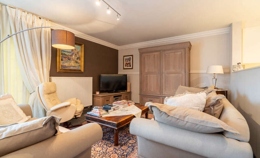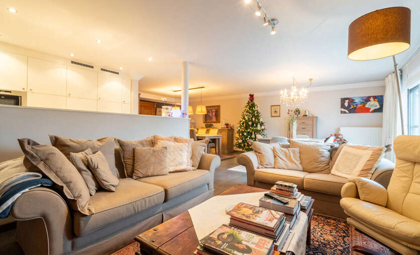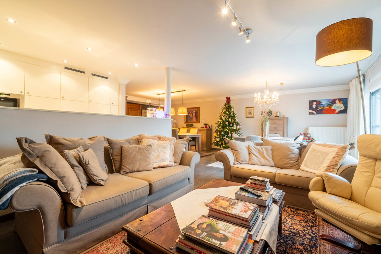 De hal leidt ons tot een zeer ruime leefruimte en zithoek genietend van een aangename lichtinval en zicht op het prachtig zonneterras.