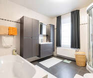 De badkamer beschikt over zowel ligbad als douche, toilet en lavabomeubel.