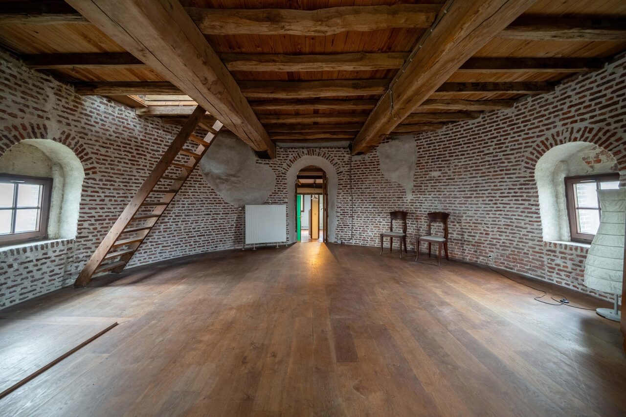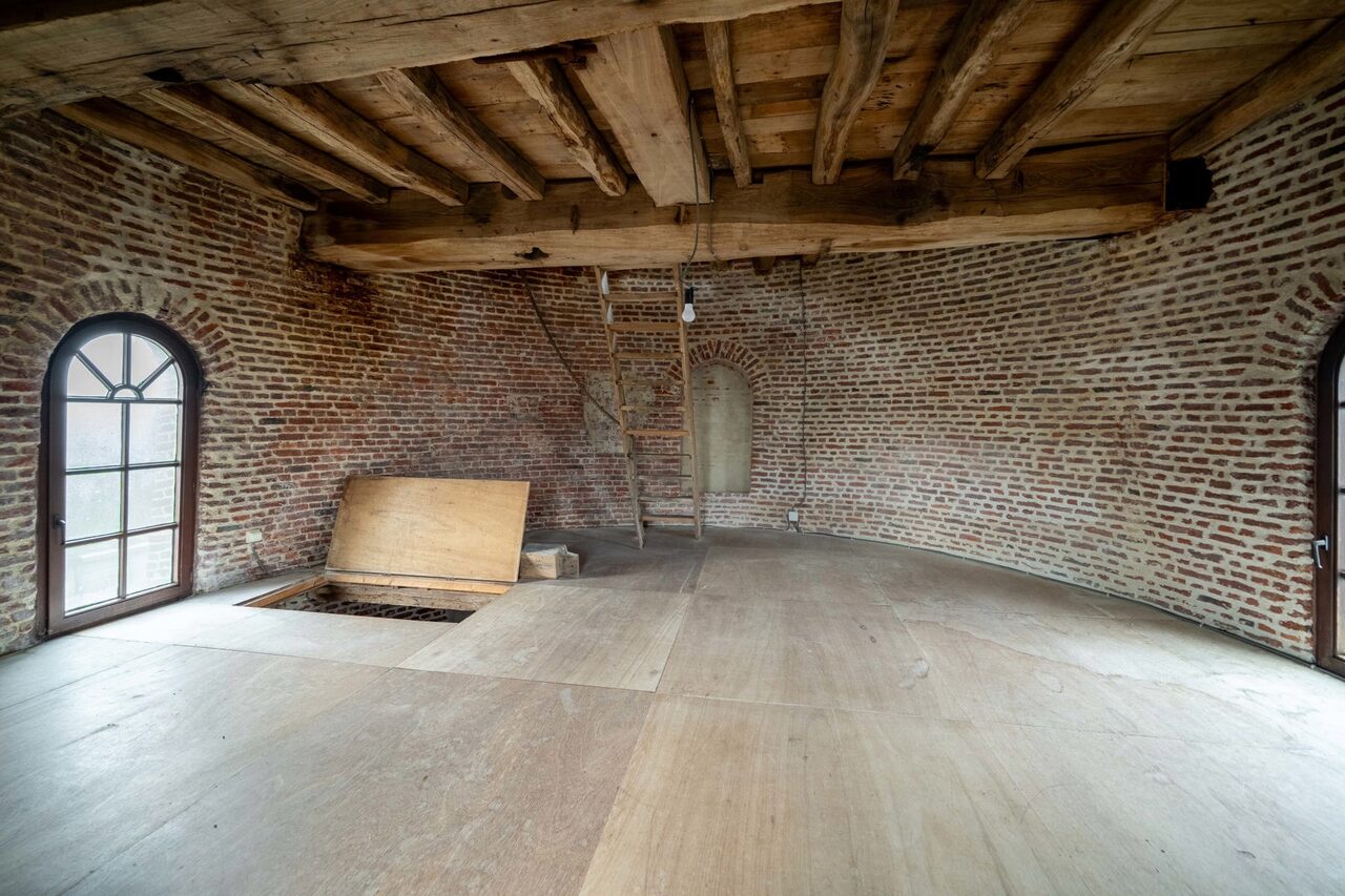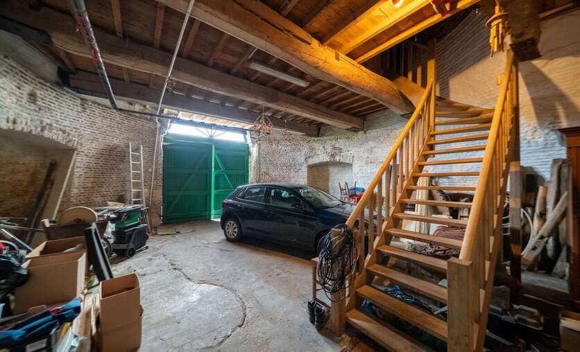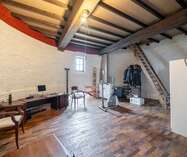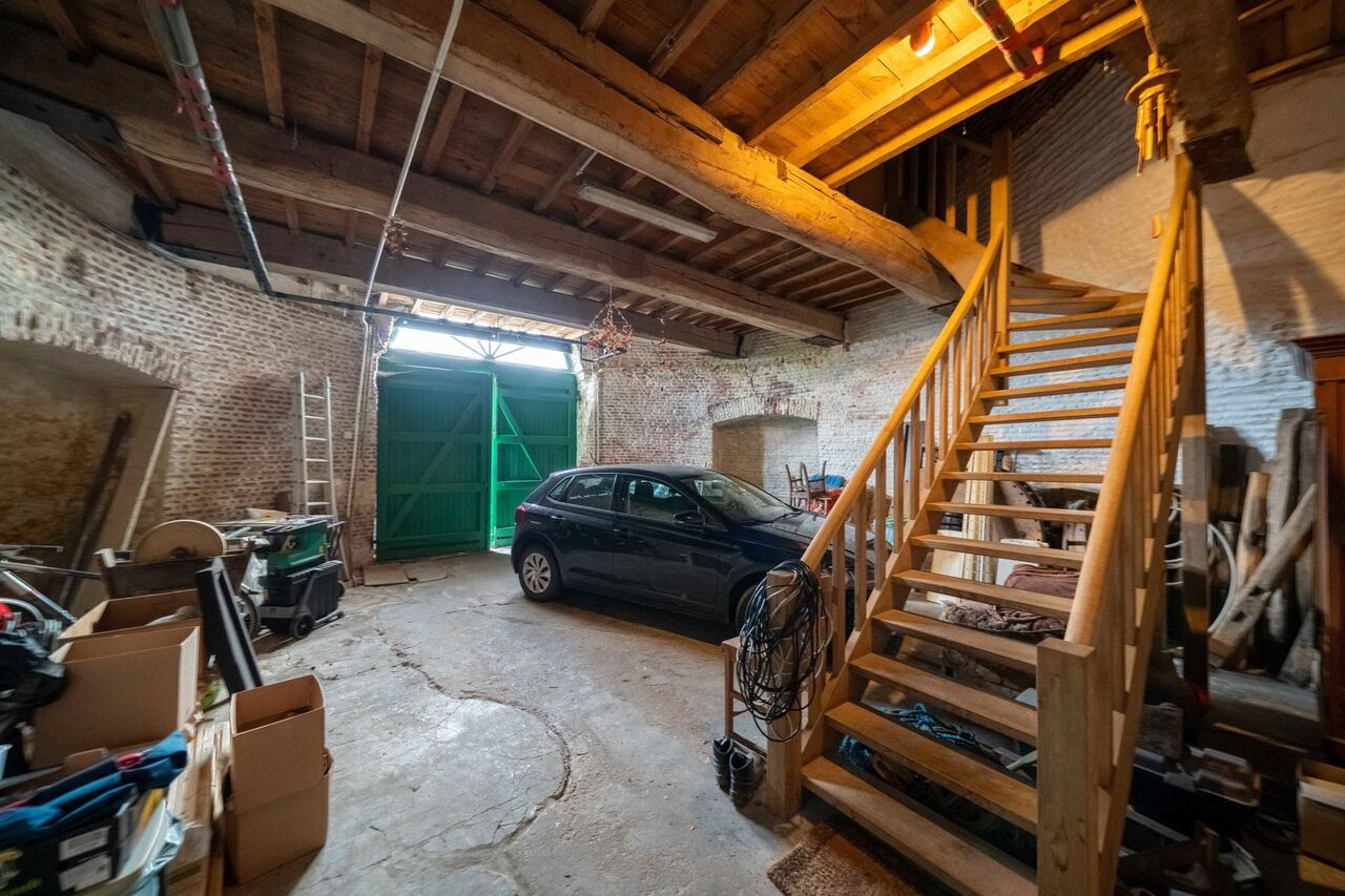 We betreden via de grote poorten van de molen de garage of berging, gelegen op het gelijkvloers. Aan de achterzijde bevindt zich nog een technische berging en dan nog een polyvalente ruimte, momenteel ingericht als extra studio met badkamer, leefruimte.