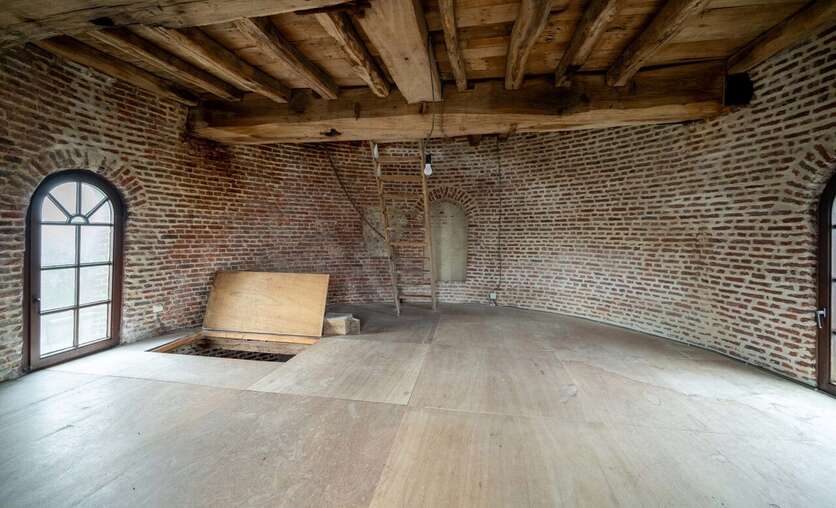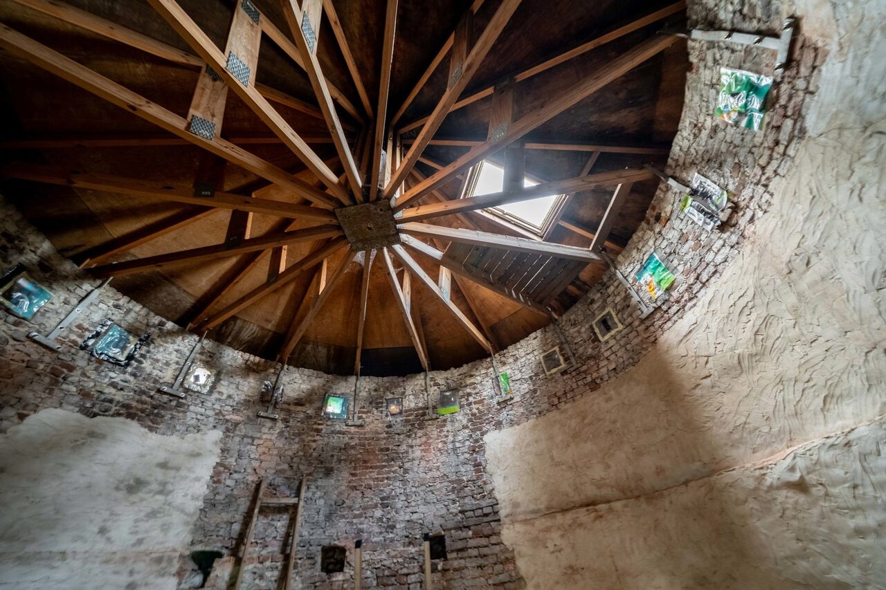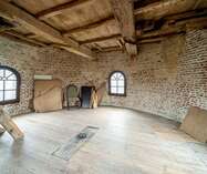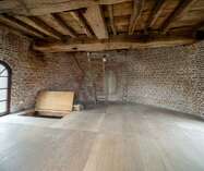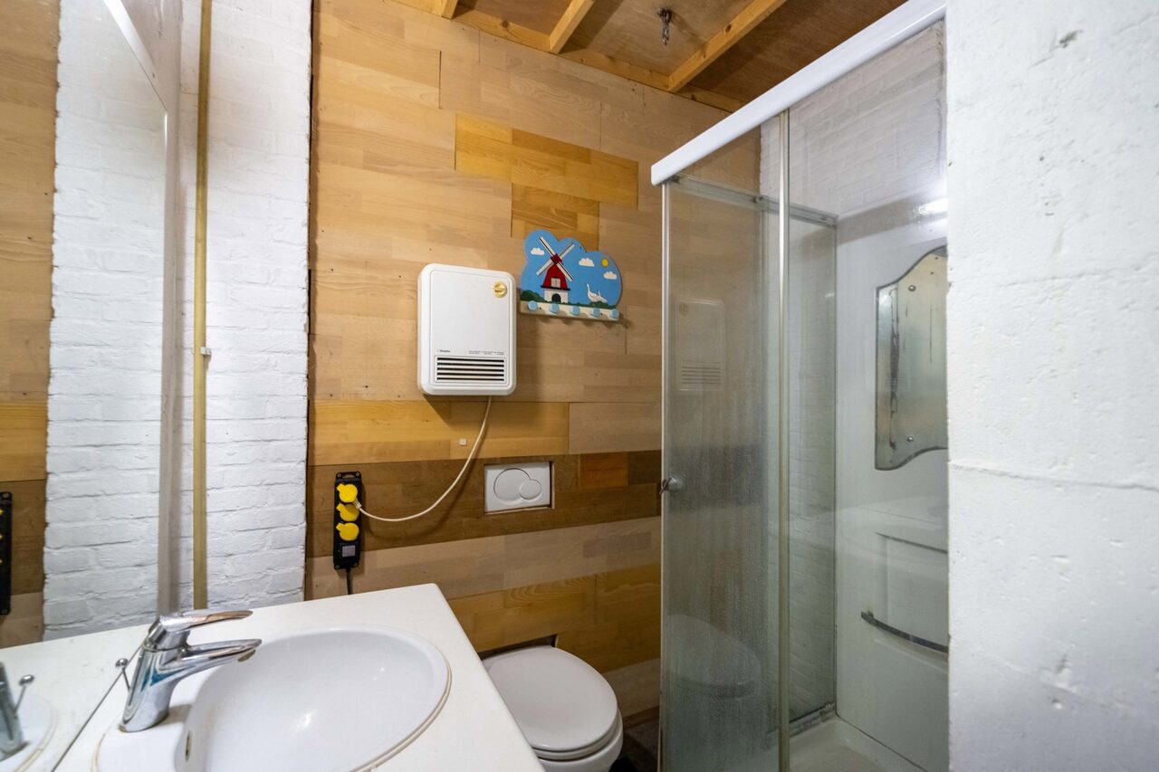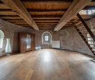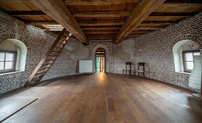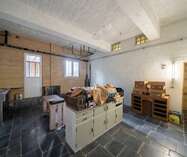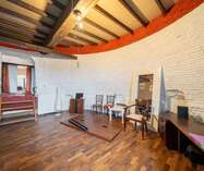 We betreden via de grote poorten van de molen de garage of berging, gelegen op het gelijkvloers. Aan de achterzijde bevindt zich nog een technische berging en dan nog een polyvalente ruimte, momenteel ingericht als extra studio met badkamer, leefruimte.