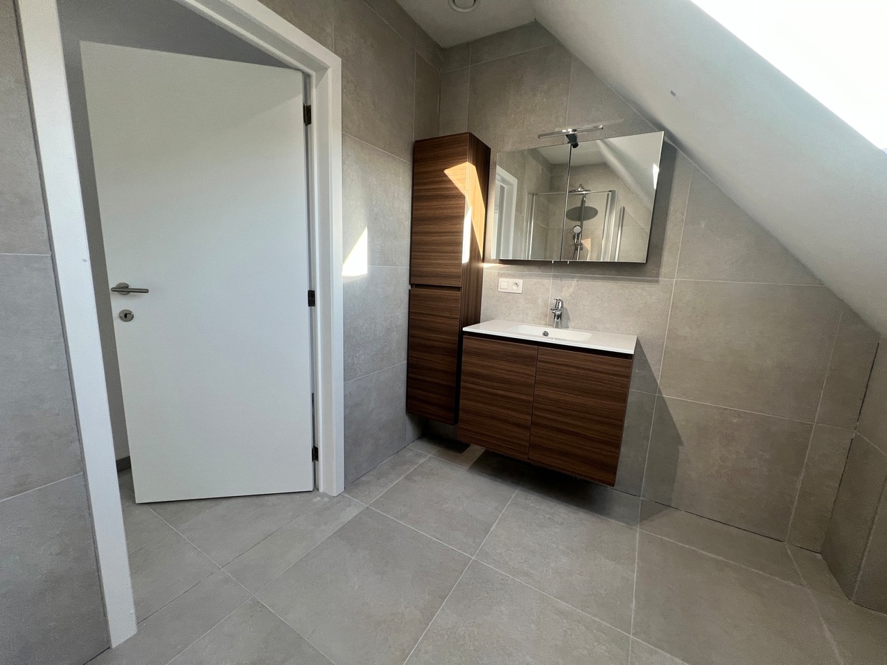De badkamer is ingericht met douche en lavabomeubel.