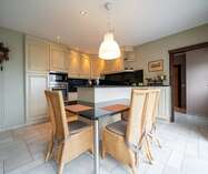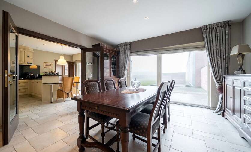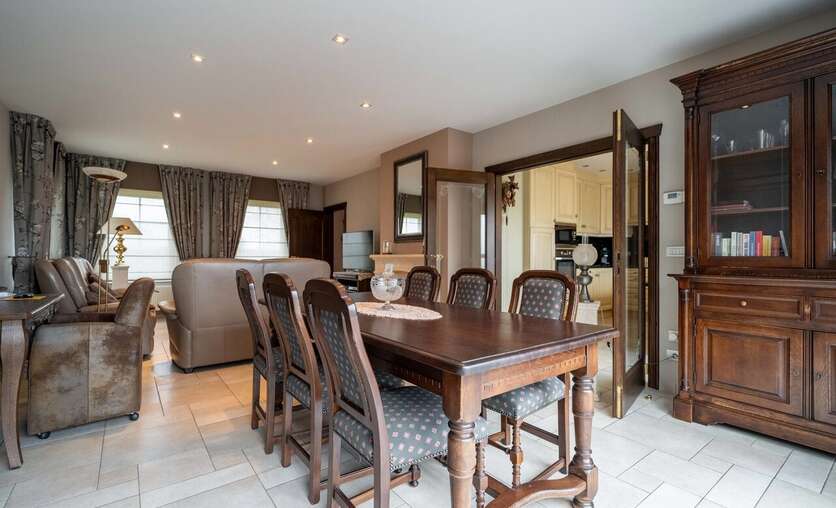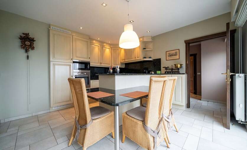 Via de voordeur/hal komen we tot de leefruimte en zithoek, de keuken is voorzien van de nodige toestellen.