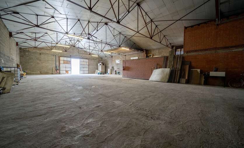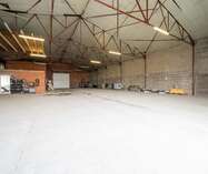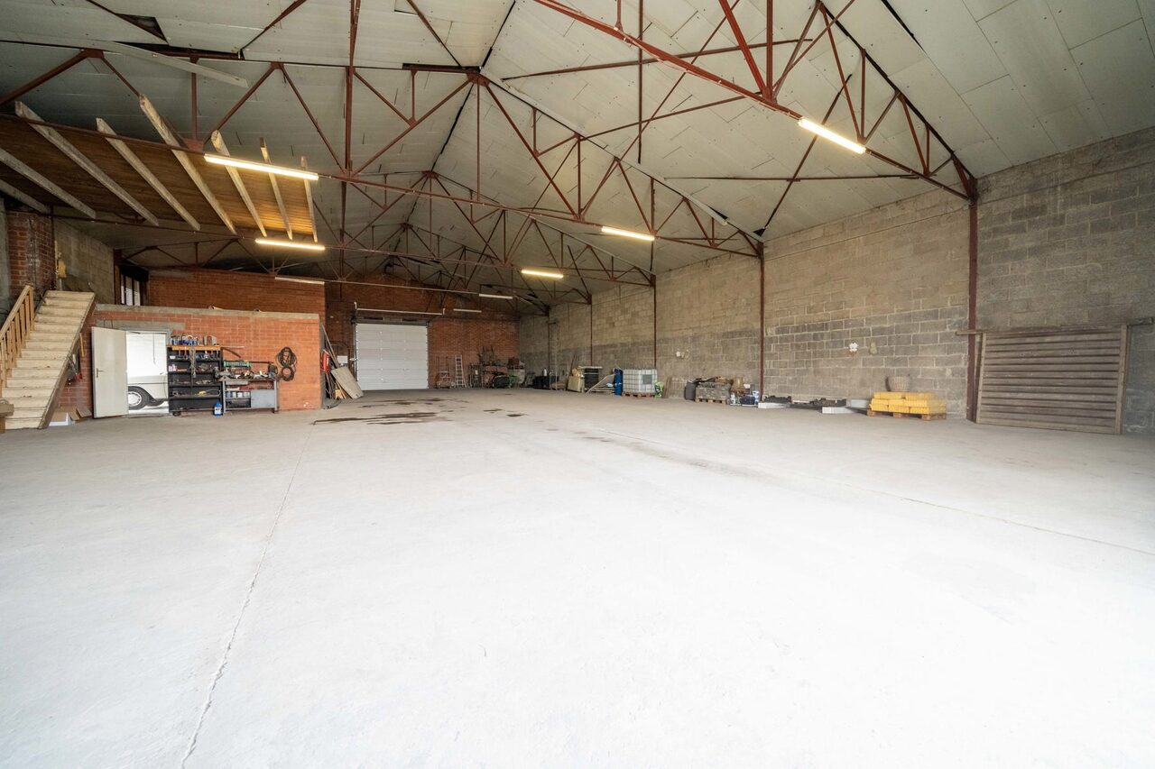 Aansluitend aan de rechterzijde hebben we de zeer grote bedrijfshal met dubbele toegangspoort zowel voor- als achteraan het gebouw.