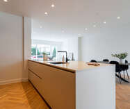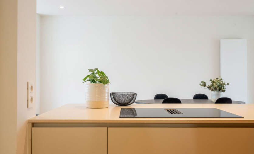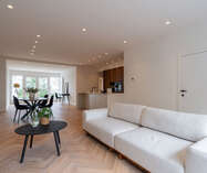 Eens in het lichtrijke appartement vinden we de grote leefruimte met zithoek en halfopen keuken.