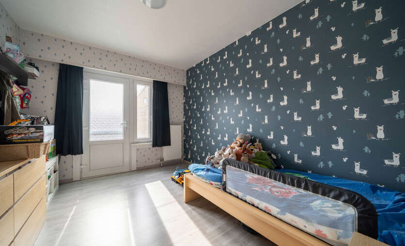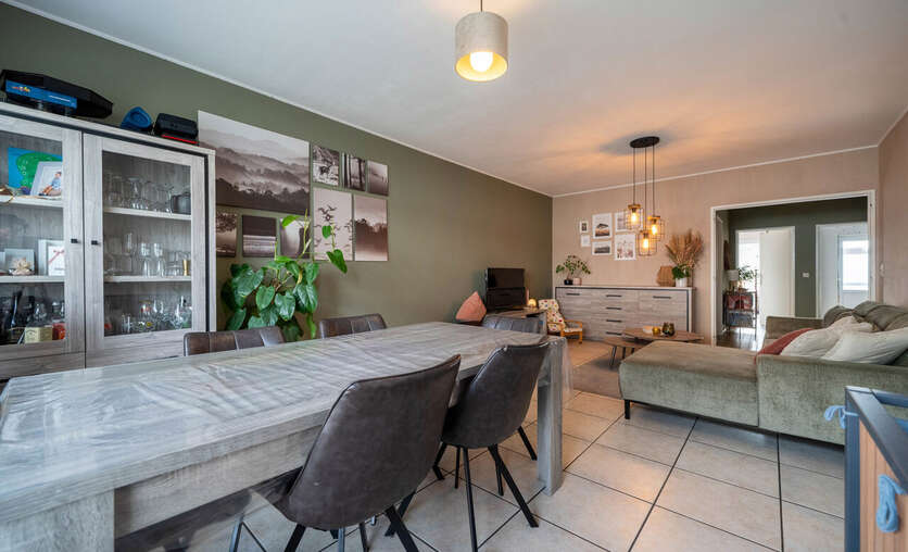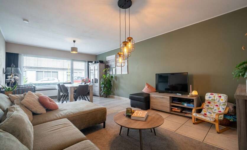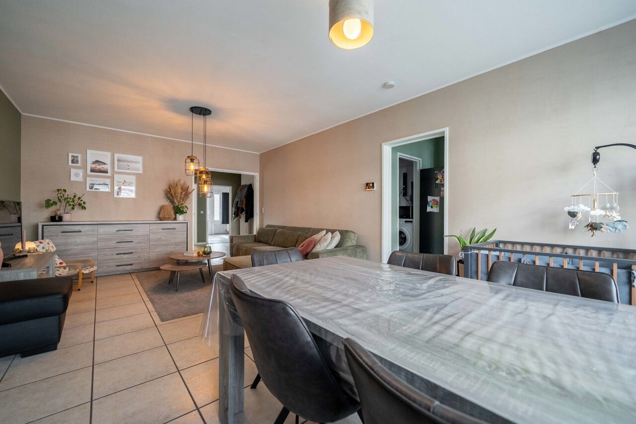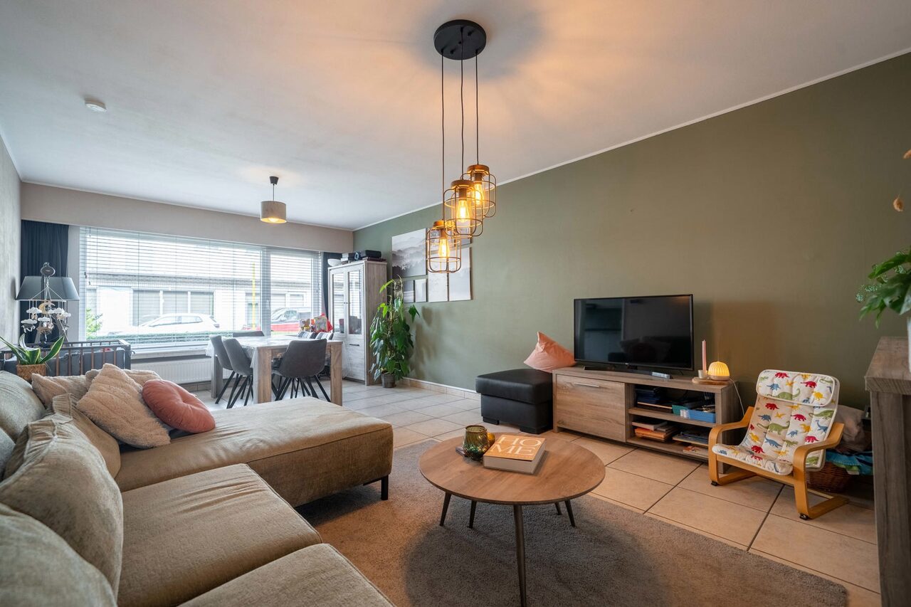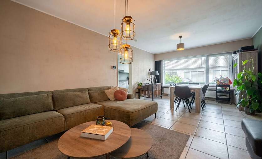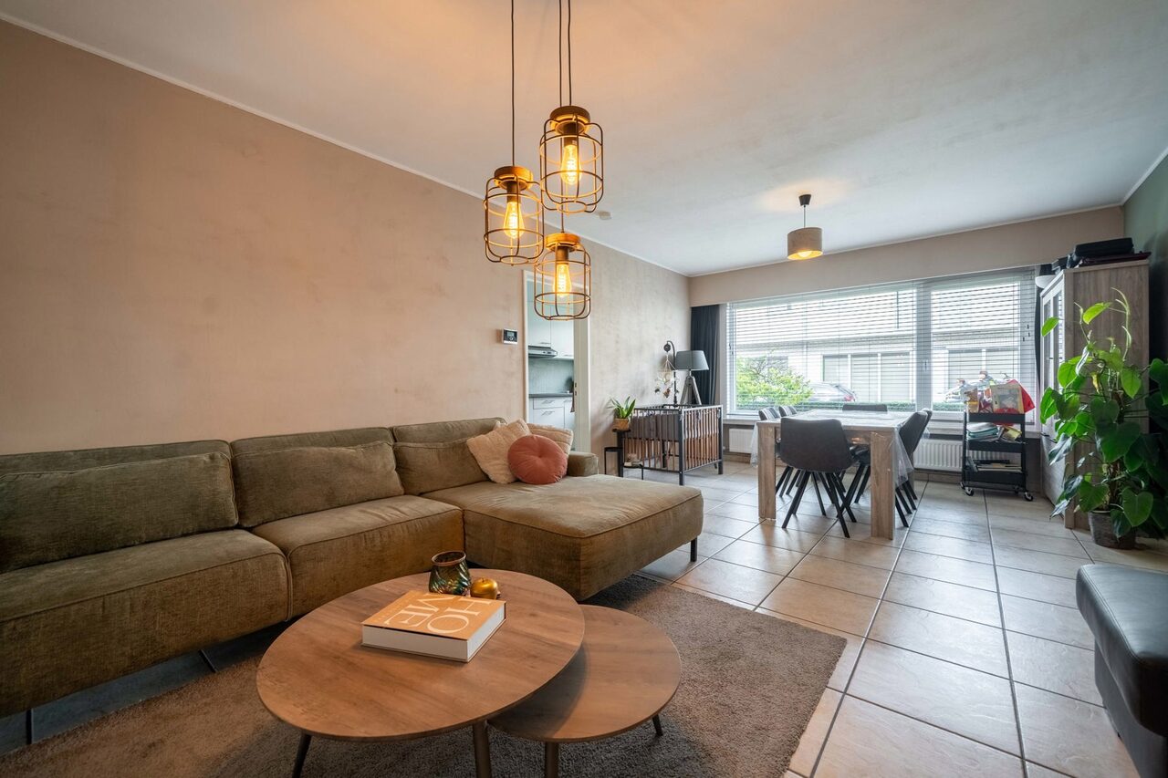 De lichtrijke leefruimte met zithoek biedt een aangenaam zicht op het ruime terras, waar u in alle rust kan genieten.