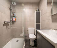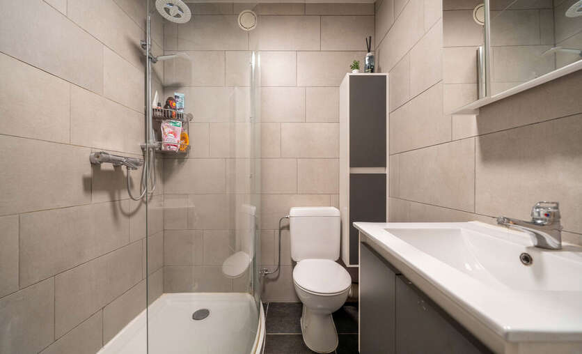 De badkamer beschikt over een lavabomeubel, inloopdouche en toilet.