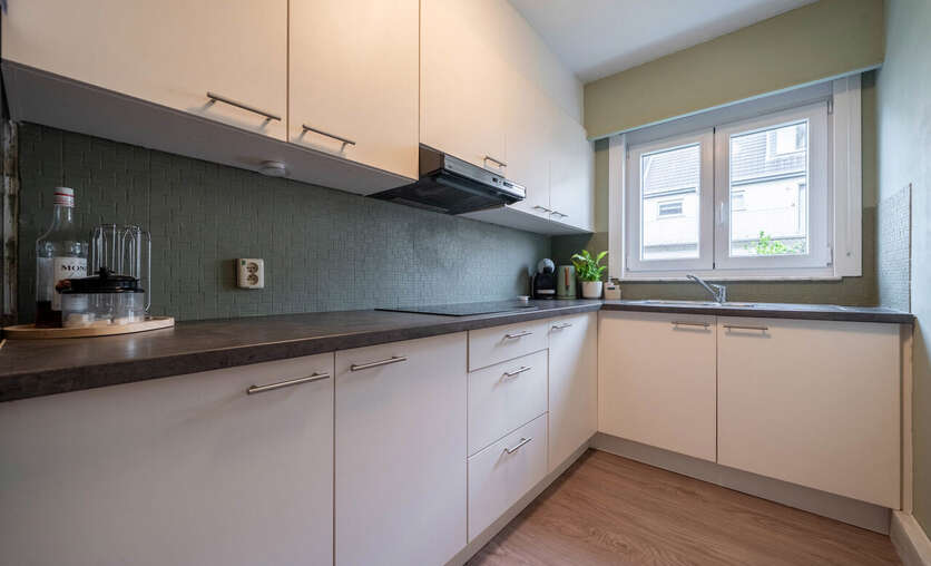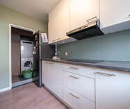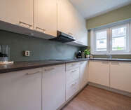 Aansluitend bevindt zich de volledig uitgeruste keuken met kasten en toestellen zoals een combi-oven, koelkast, spoelbak en vaatwasser.
