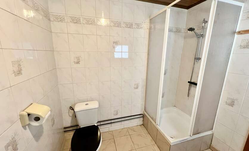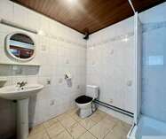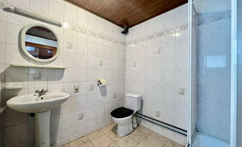 De badkamer beschikt over een douche, lavabo en toilet.