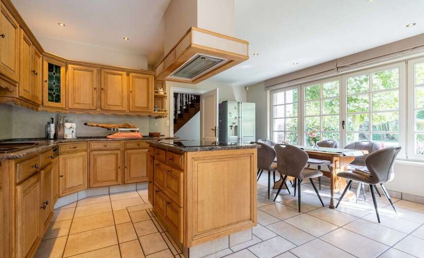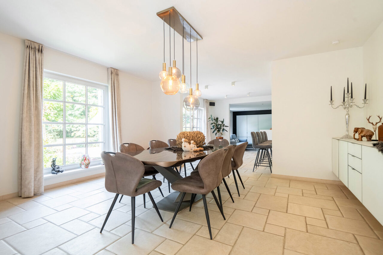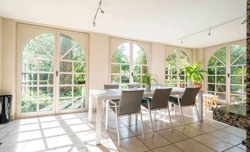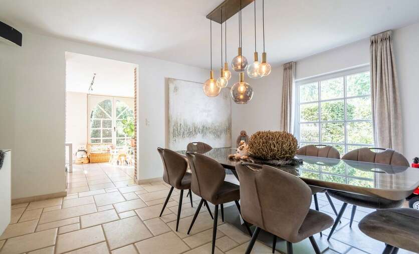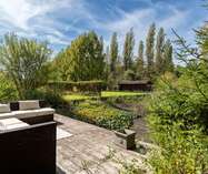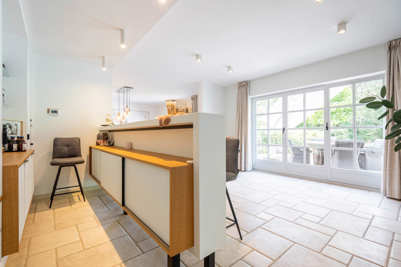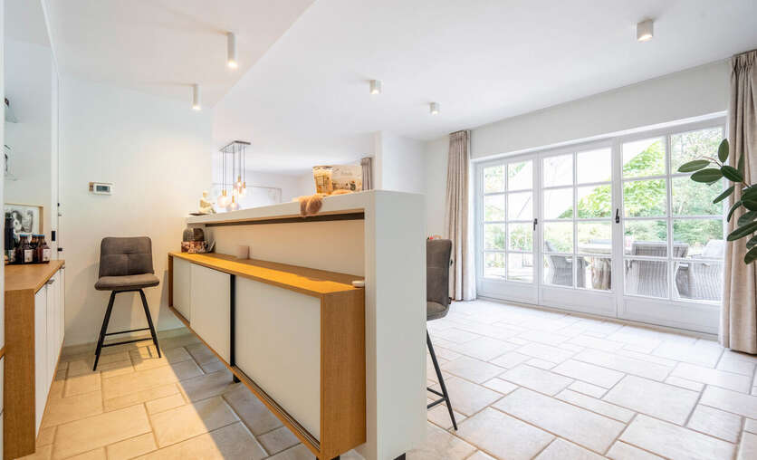 Het pand zelf is voorzien van een prachtige leefruimte met keuken en eetkamer, allen zicht op de tuin en toegang tot de rondom gelegen terrassen.