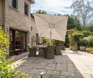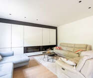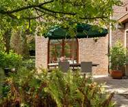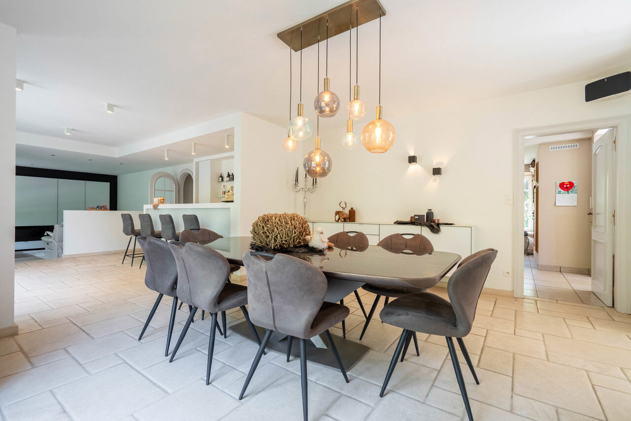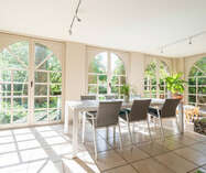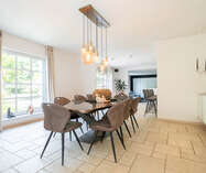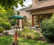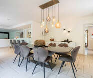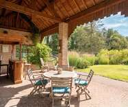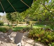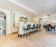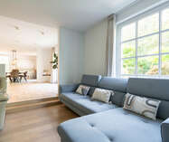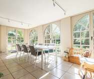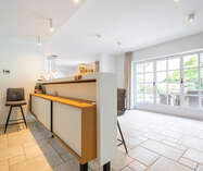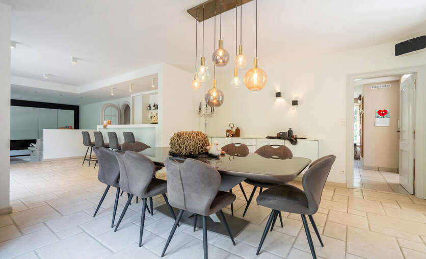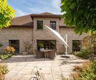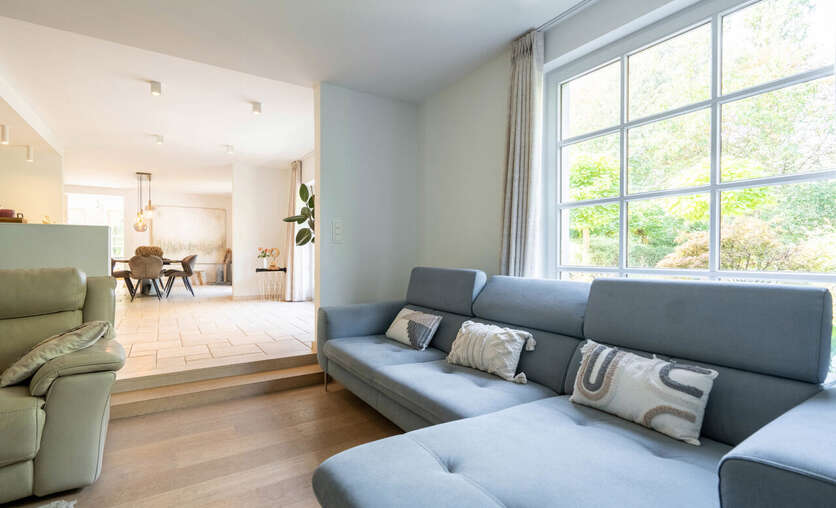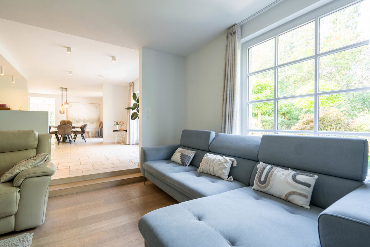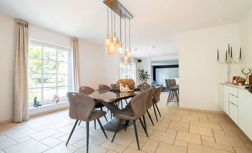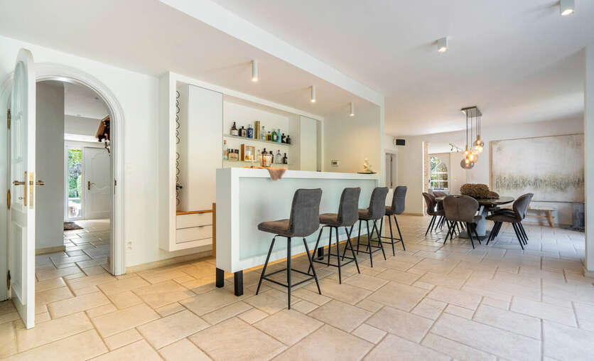 Het pand zelf is voorzien van een prachtige leefruimte met keuken en eetkamer, allen zicht op de tuin en toegang tot de rondom gelegen terrassen.