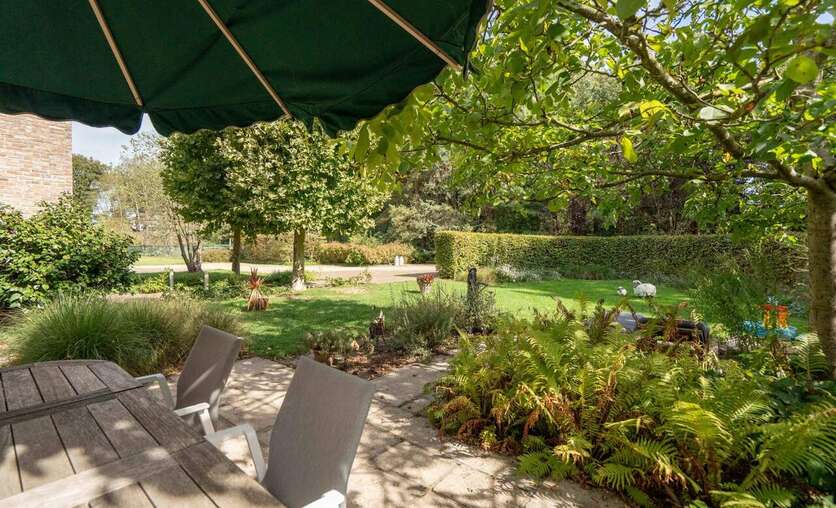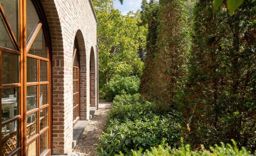 Eens we via de oprit aan de villa komen, geniet men onmiddellijk van het prachtige groene kader waarin deze hoeve werd gebouwd.