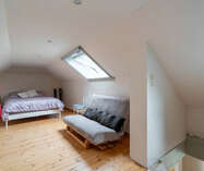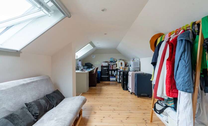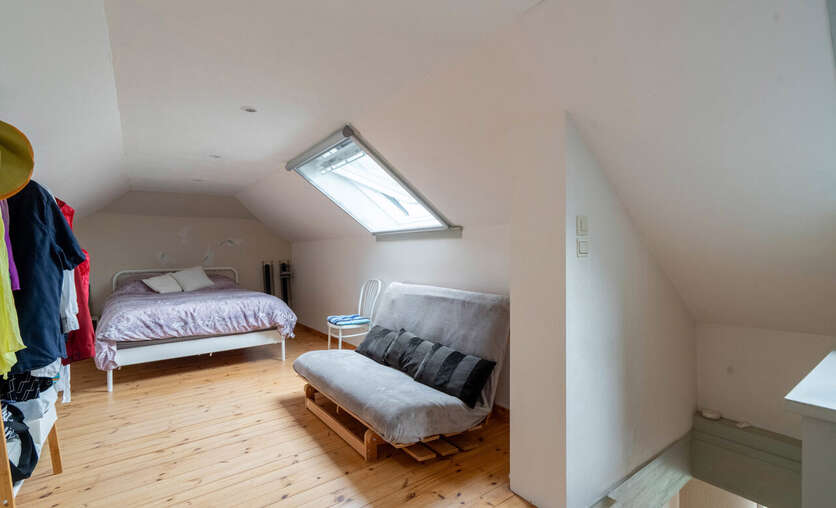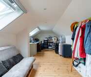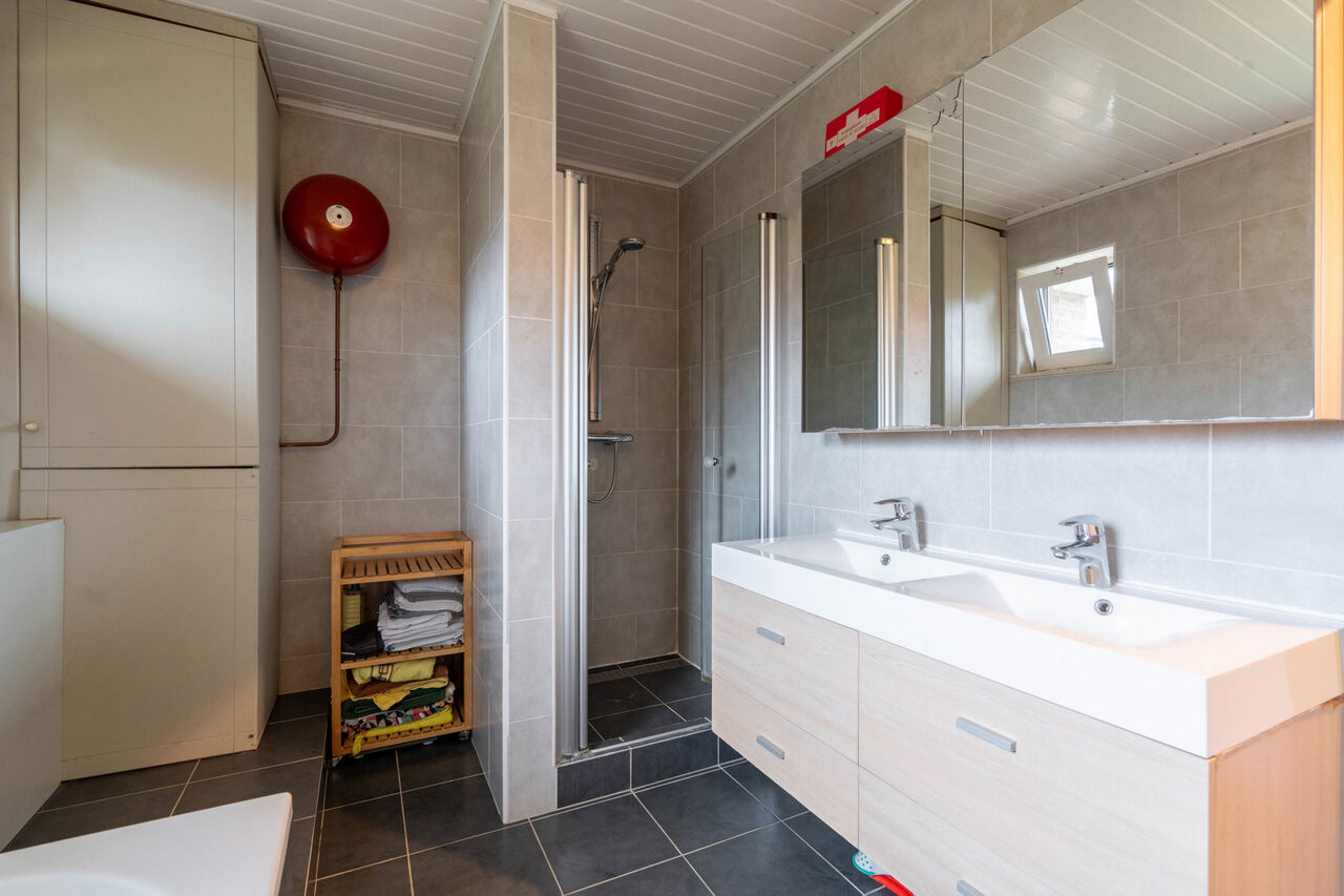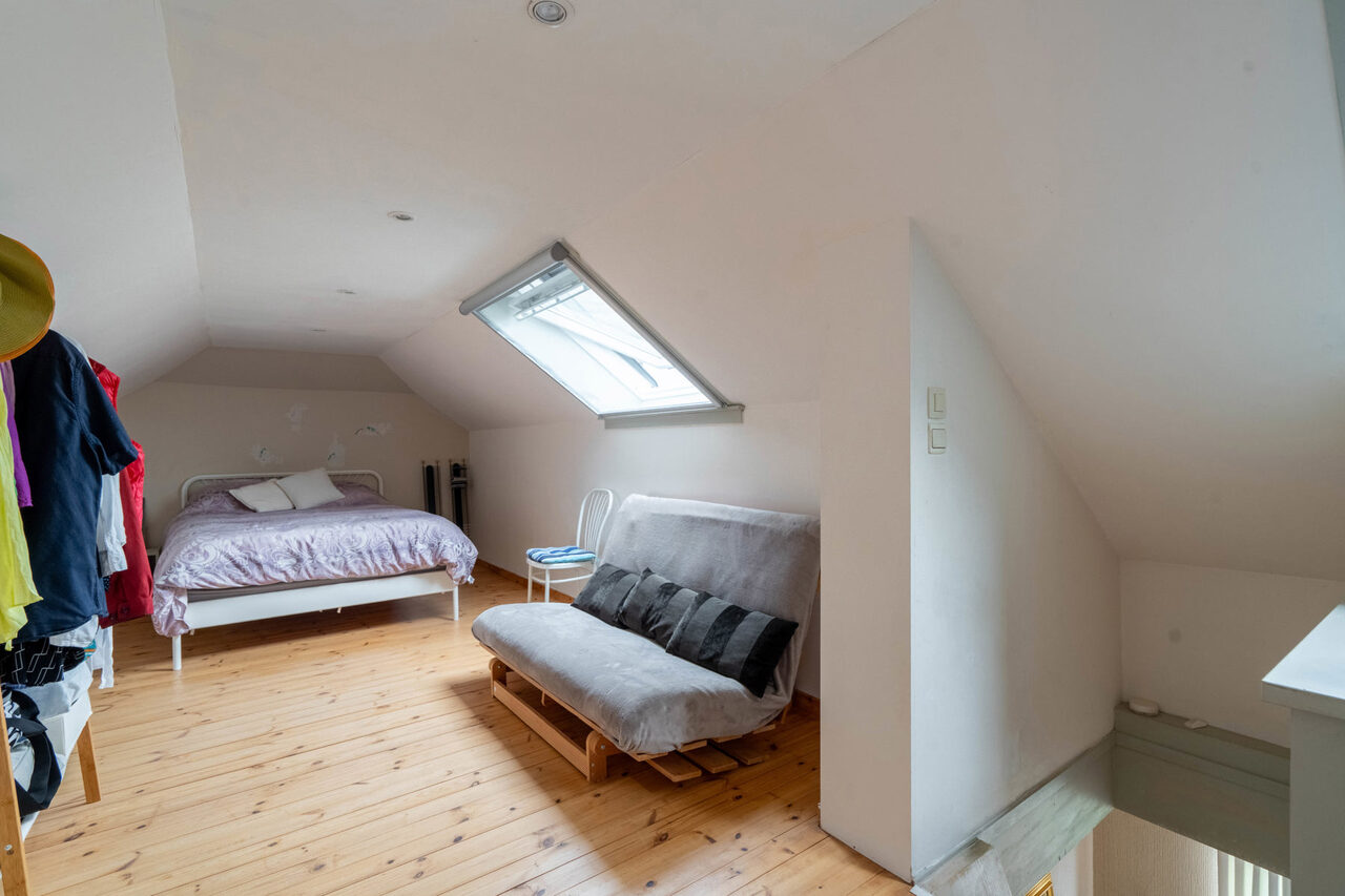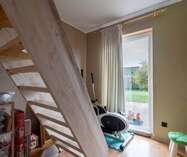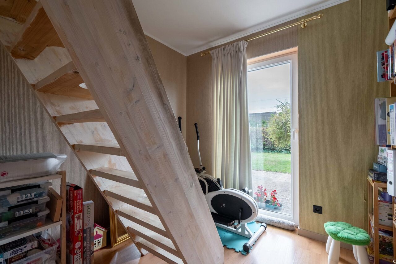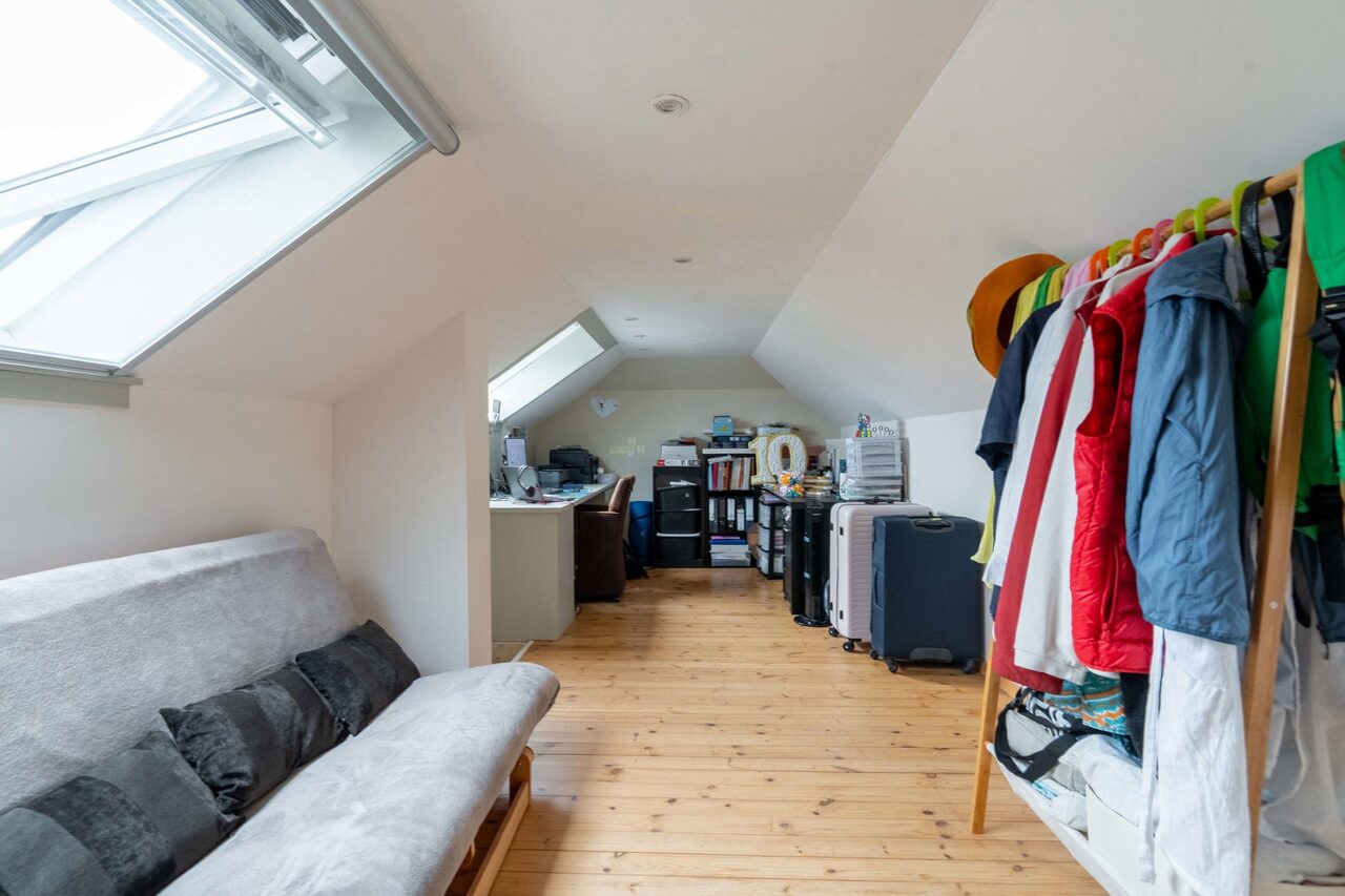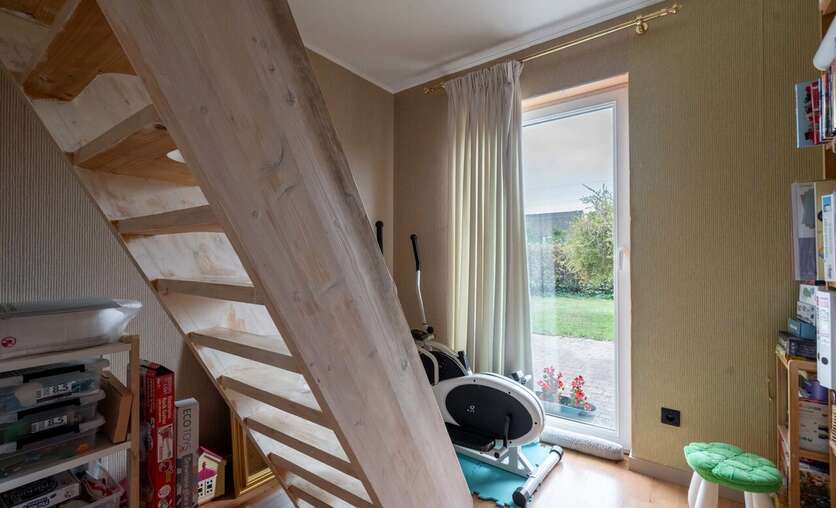 De 3e kamer is ingericht als extra berging en voorzien van een vaste trap naar de de zolderverdieping die volledig werd afgewerkt waar nog een extra slaapkamer en bureau aanwezig is.
