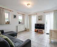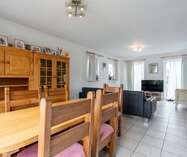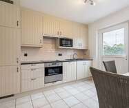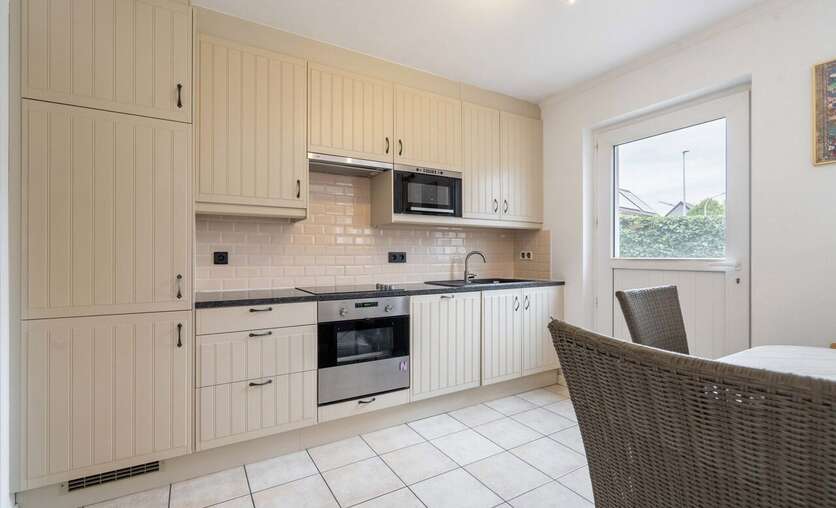 De open keuken is voorzien van de nodige kasten en toestellen zoals kookplaat, oven, microgolfoven, spoelbak, vaatwasser en dampkap.