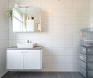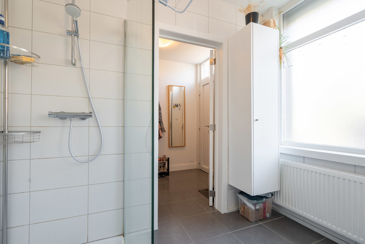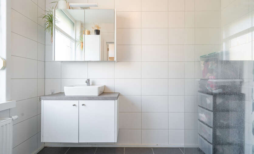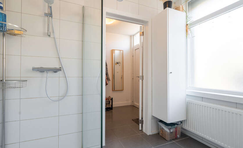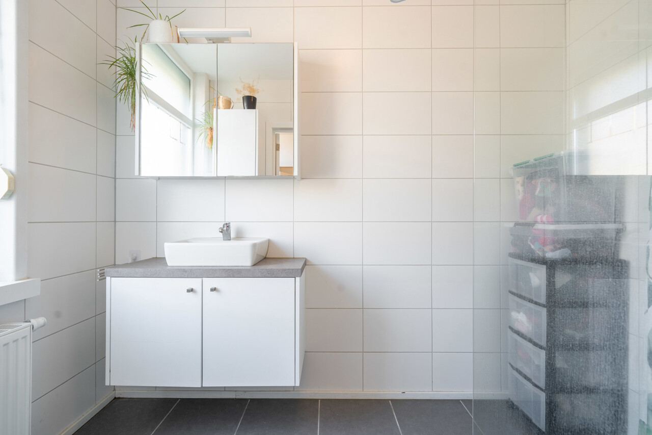 Daaropvolgend hebben we de badkamer voorzien van een inloopdouche, lavabomeubel en ingebouwde kolomkast.