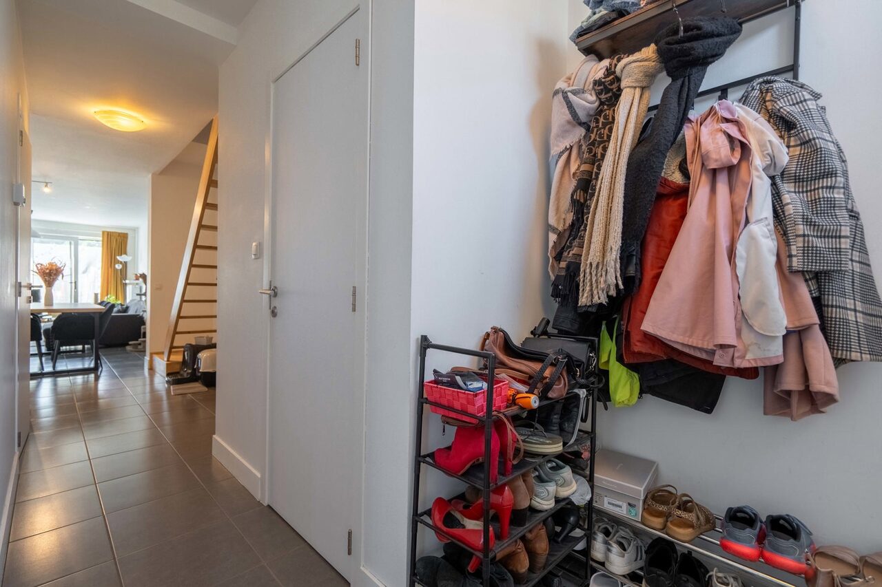 Langs de voorzijde komen we via de inkomdeur terecht in de aangename hal, waar we tevens het apart gastentoilet terugvinden.