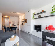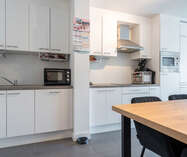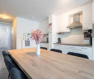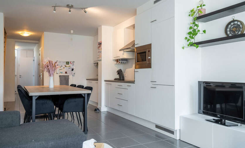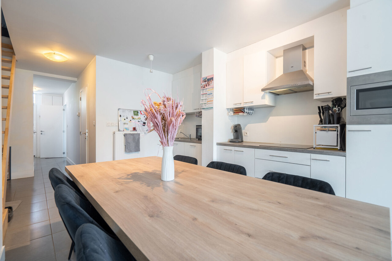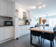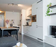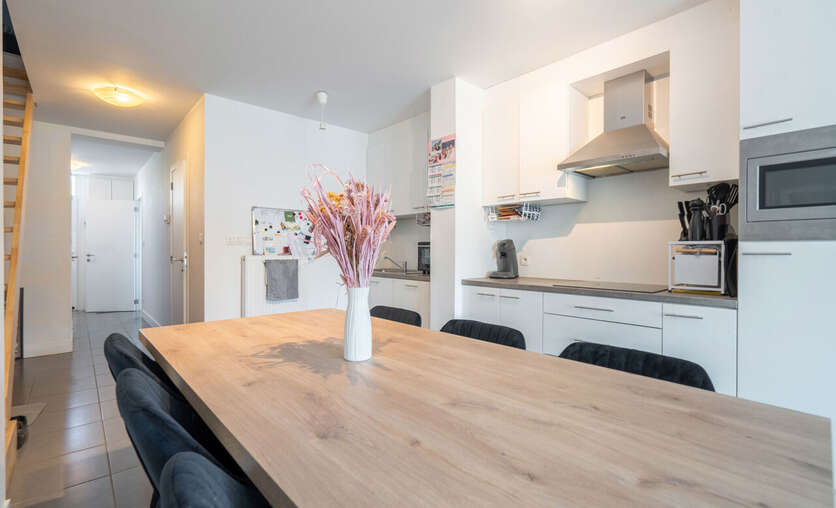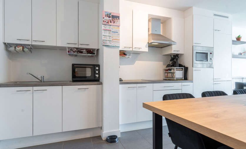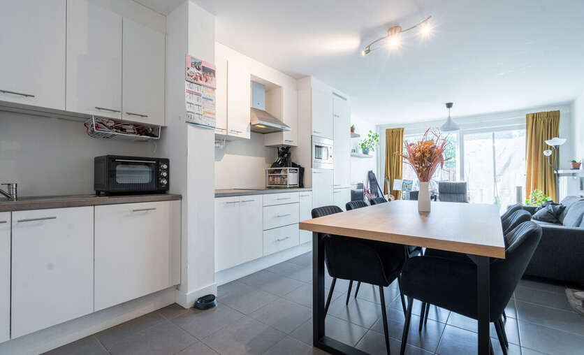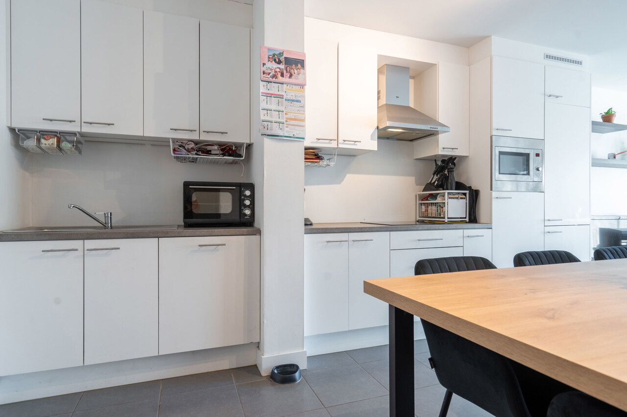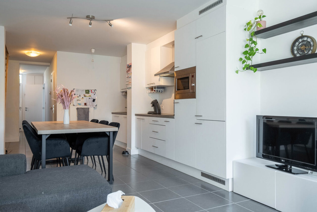Aansluitend hebben we de open leefruimte voorzien van een prachtige keuken met de nodige toestellen zoals vaatwasmachine, koelkast, combi-oven, ..