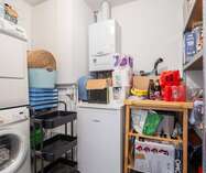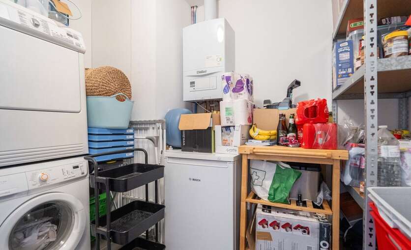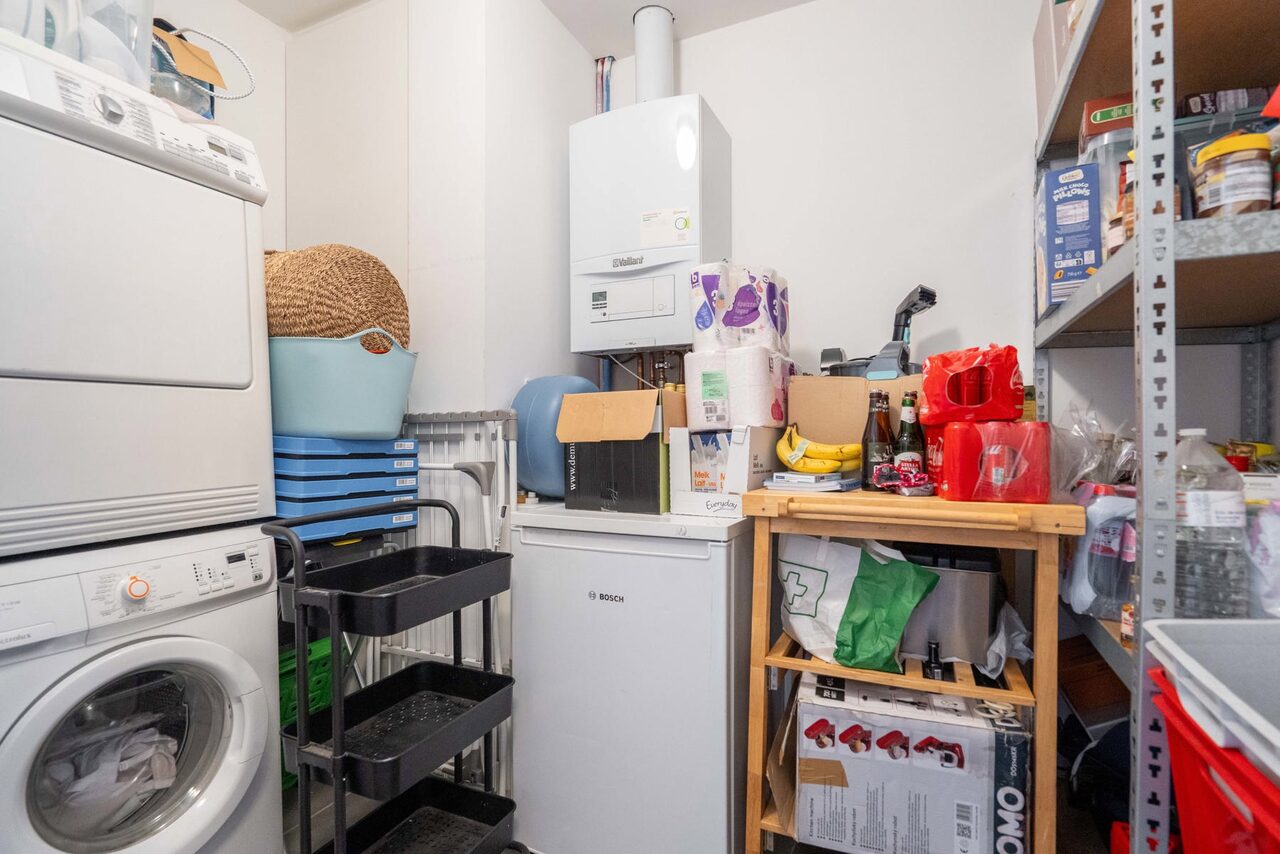 Verder vinden we nog een ruime berging met de voorzieningen voor wasmachine/droogkast, een uitgietbak en de nodige bergruimte.